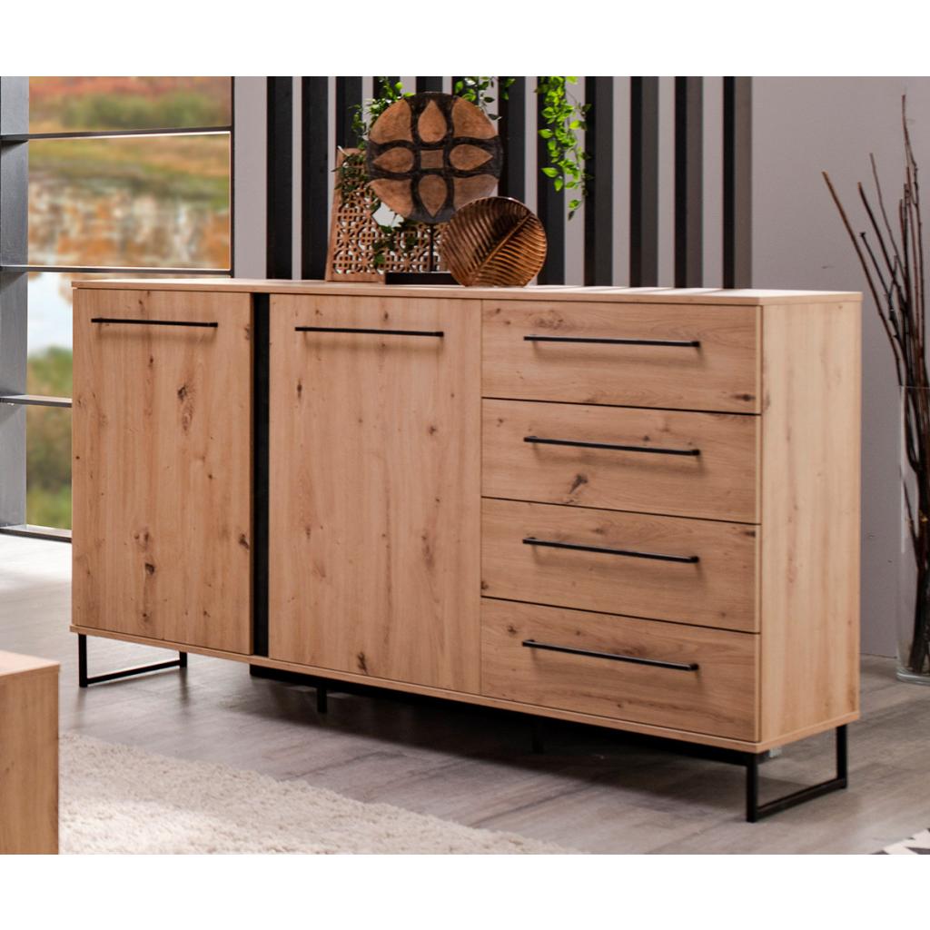 Fantástico aparador de 2 puertas y 4 cajones en color roble, y plataforma metálica en negro. Incluye dos estantes en el interior. Cuenta con gran capacidad en su interior. Puede combinarlo con la composición 212500000050.
