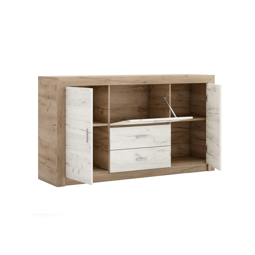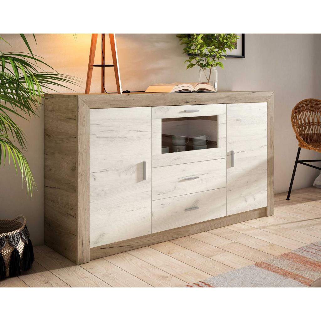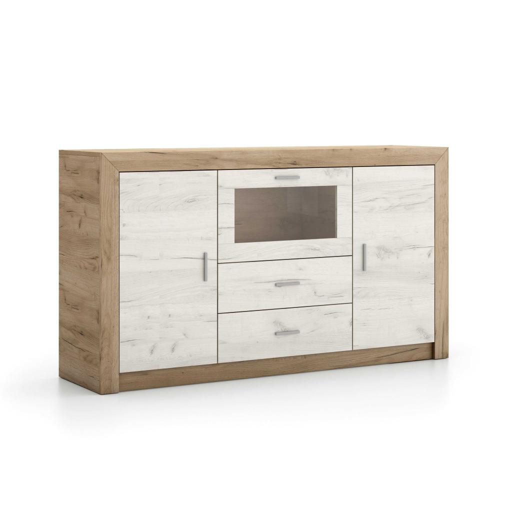 Rebajas Oferta Novedad Aparador en roble y blanco Ref: 098801000146 269,99 € Sencillo aparador en roble y blanco. Con 2 puertas, 2 cajones y vitrina.Composición: Tablero de partículas, tablero de fibras, lámina de papel, borde de plástico, vidrio templado Disponibilidad: Color Roble y blanco Tamaño 154x86x40 Ancho x Alto x Fondo Cantidad