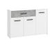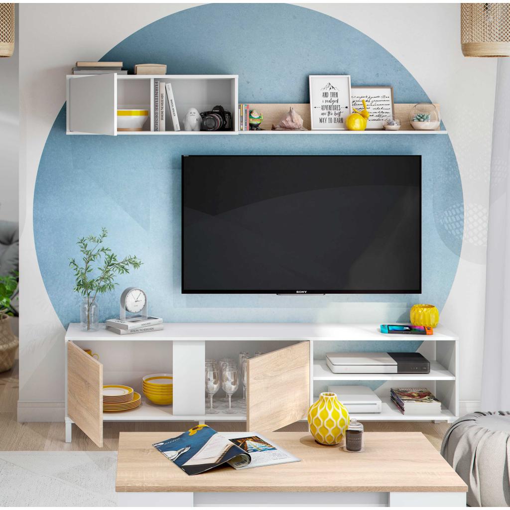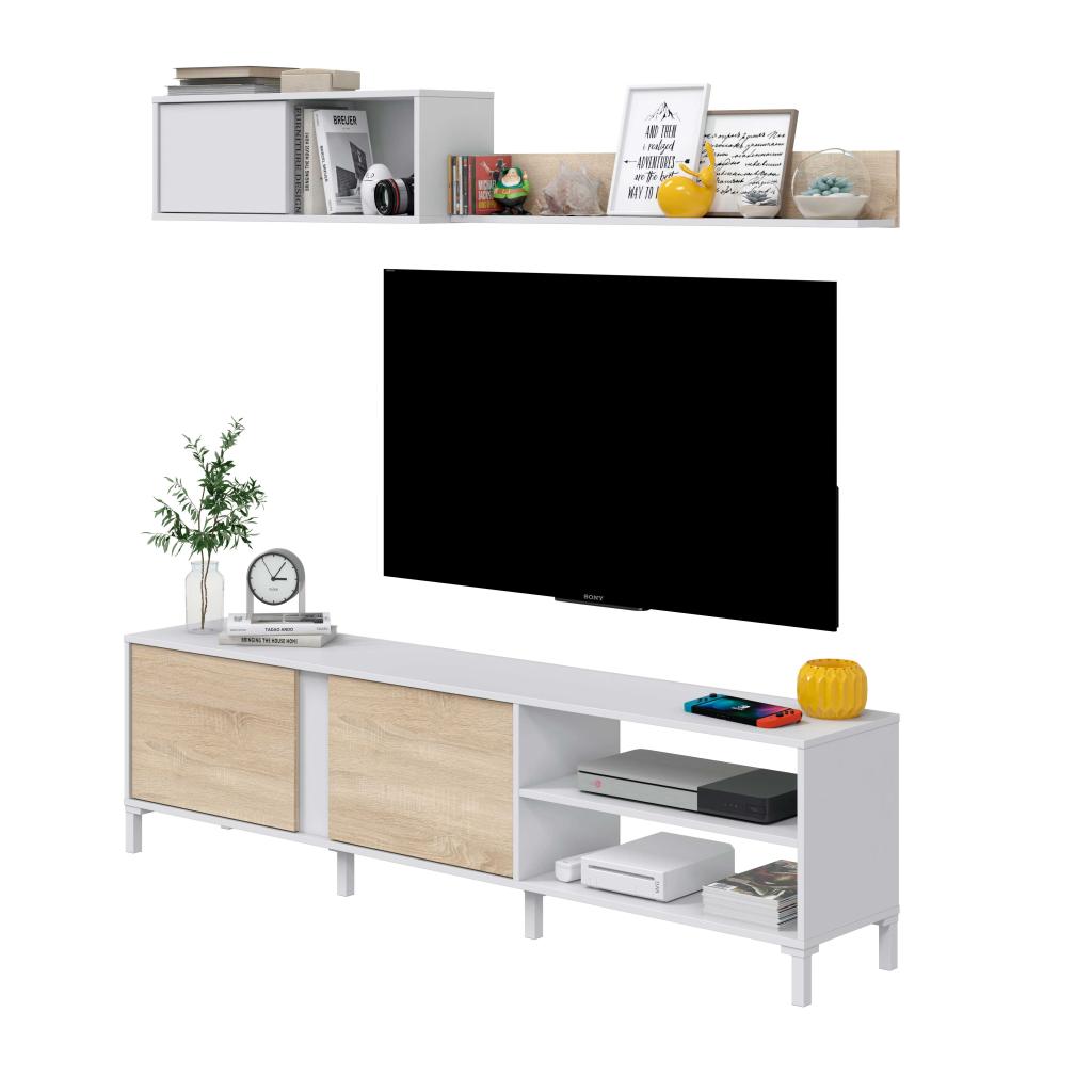Aplilable de salón - Blanco artik y roble canadian, Mueble Tv 180x48x33 cm Módulo Superior 80x28x24 cm Estante de Colgar 100x15x13 cm Ancho x Alto x Fondo