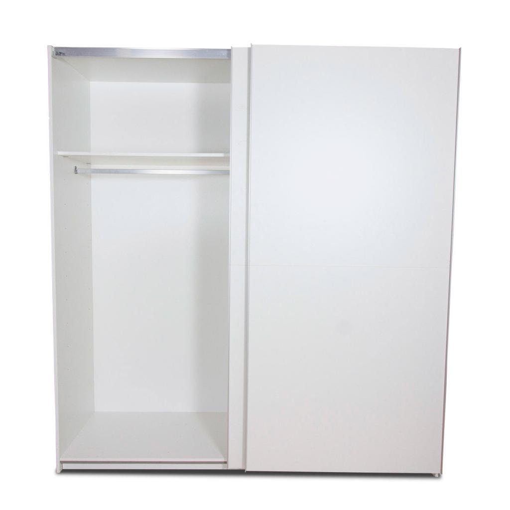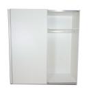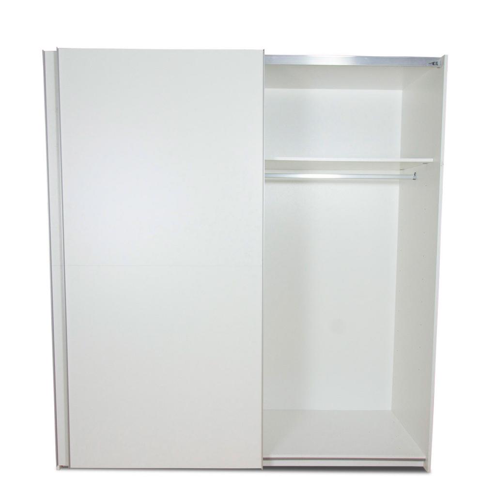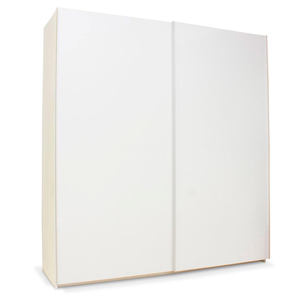 Armario de 2 puertas correderas de 200 cm. de ancho. Diseño moderno y funcional con herrajes metálicos acabado en blanco. Interiores en blanco. Incluye 2 barras y 2 estantes altillo. Compatible con cajonera 184100000407, opcional.