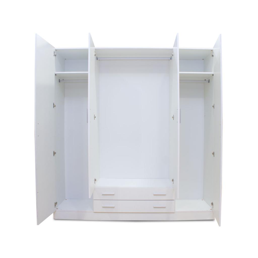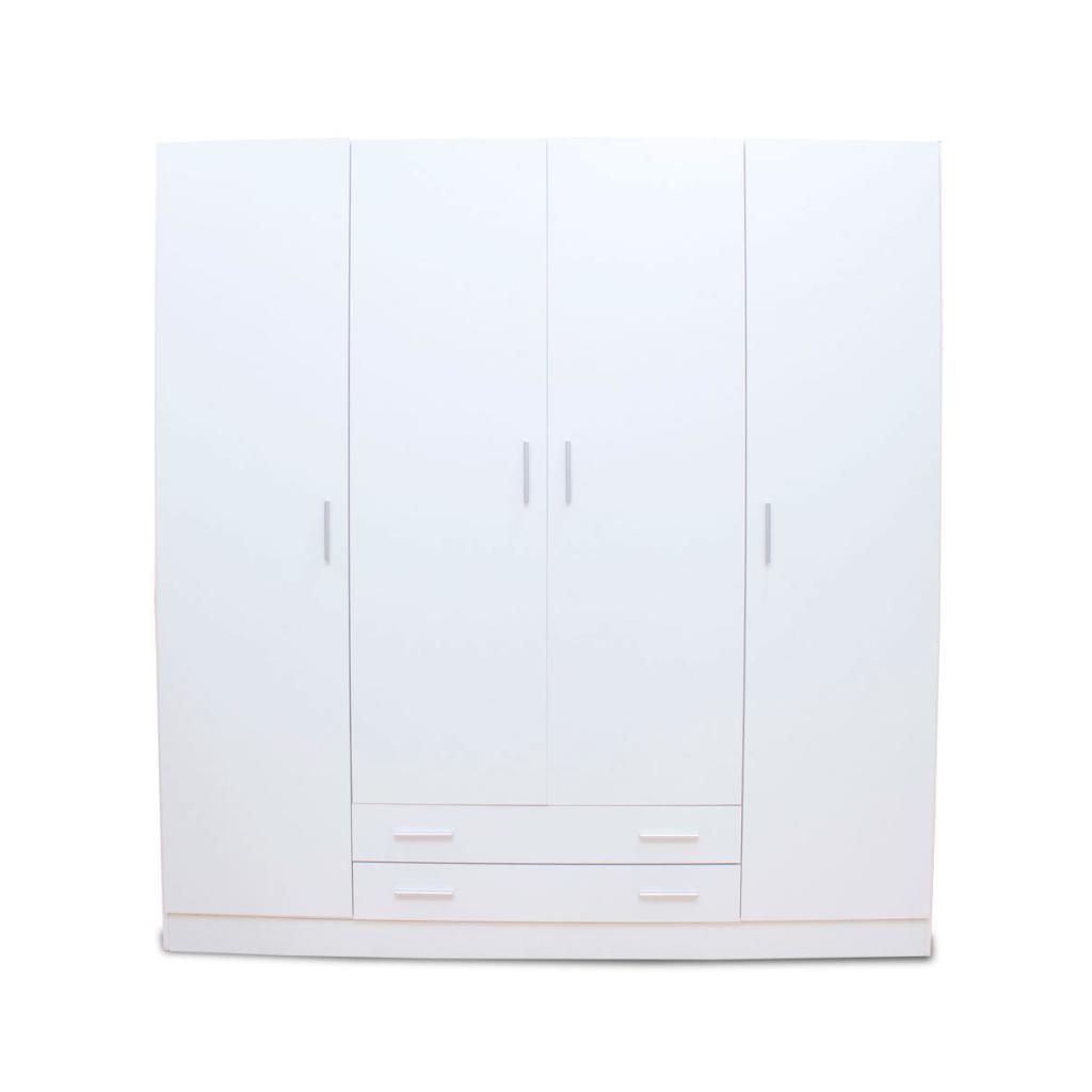 Rebajas Oferta Novedad Armario de 4 puertas y 2 cajones en color blanco Ref: 188700000033 289,99 € Elegante armario de 4 puertas y 2 cajones en color blanco. Tiradores en color plata. Incluye dos estantes en la parte superior y tres barras.Composición: Tablero de partículas, tablero de fibras, lámina de papel, borde de plástico. Disponibilidad: Color Blanco Tamaño 200x210x52 cms Ancho x Alto x Fondo Cantidad