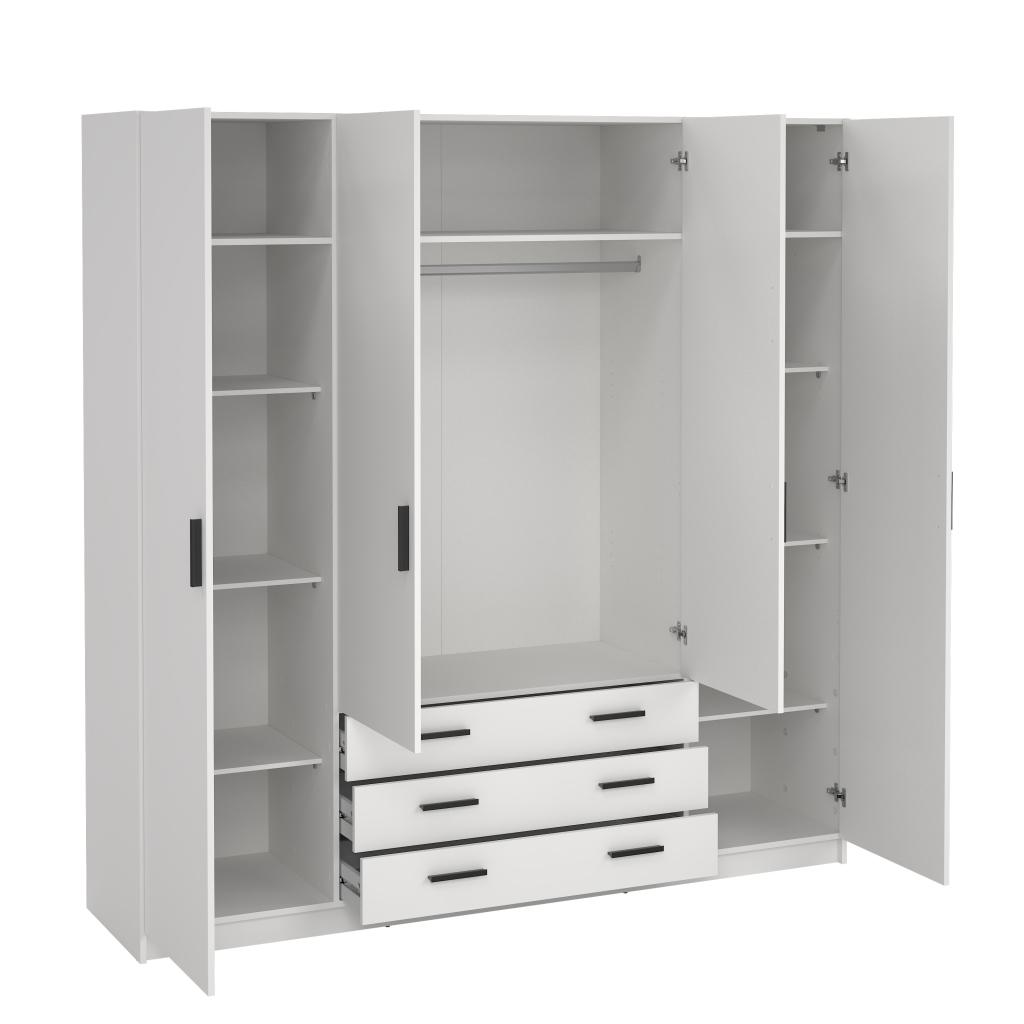 El armario Sprint es una solución de almacenamiento funcional y espaciosa con cuatro puertas abatibles, una barra para ropa y tres cajones. Incluye ocho estantes, seis ajustables y dos fijos, que ofrecen una organización versátil para tu ropa y objetos esenciales. Diseñado para ser práctico, es perfecto para cualquier hogar moderno.