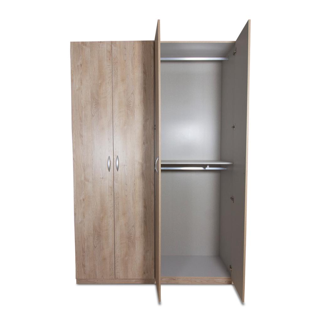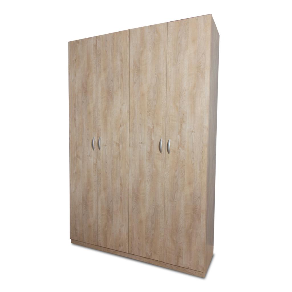 Armario de 4 puertas abatibles gran capacidad, con un acabado en color roble bodega de 160 cm. de ancho. Interiores acabados en textil. Incluye 4 barras y 2 estantes.