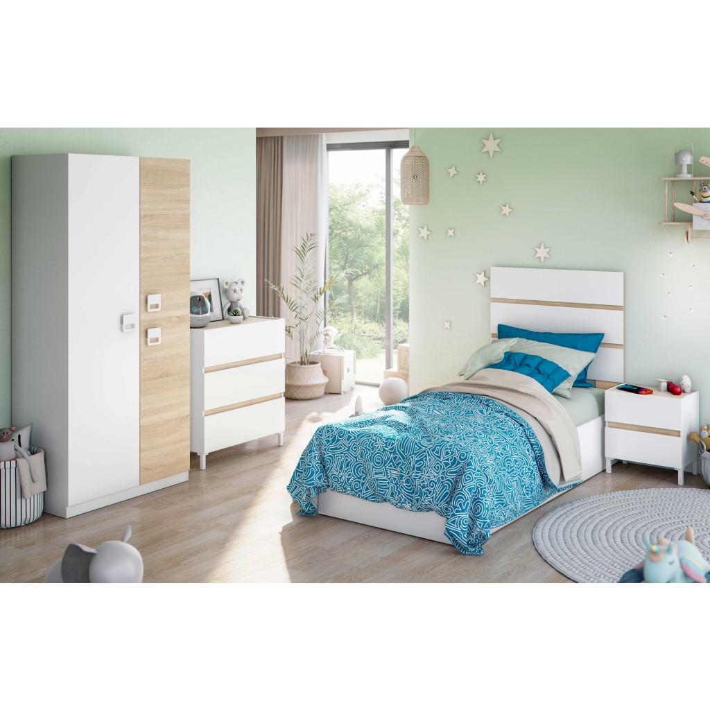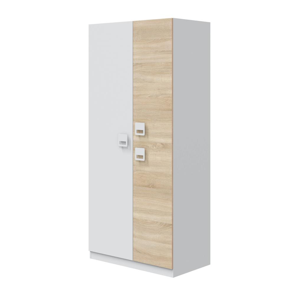 Rebajas Oferta Novedad Armario Juvenil Ref: 015400000519 194,99 € Armario de 3 puertas con barra de colgar y tres estantes en su interior. Composición: Tablero de partículas, tablero de fibras, lámina de papel, borde de plástico. Disponibilidad: Color Blanco / Roble Tamaño Armario. 90x200x52 cm Ancho x Alto x Fondo Cantidad