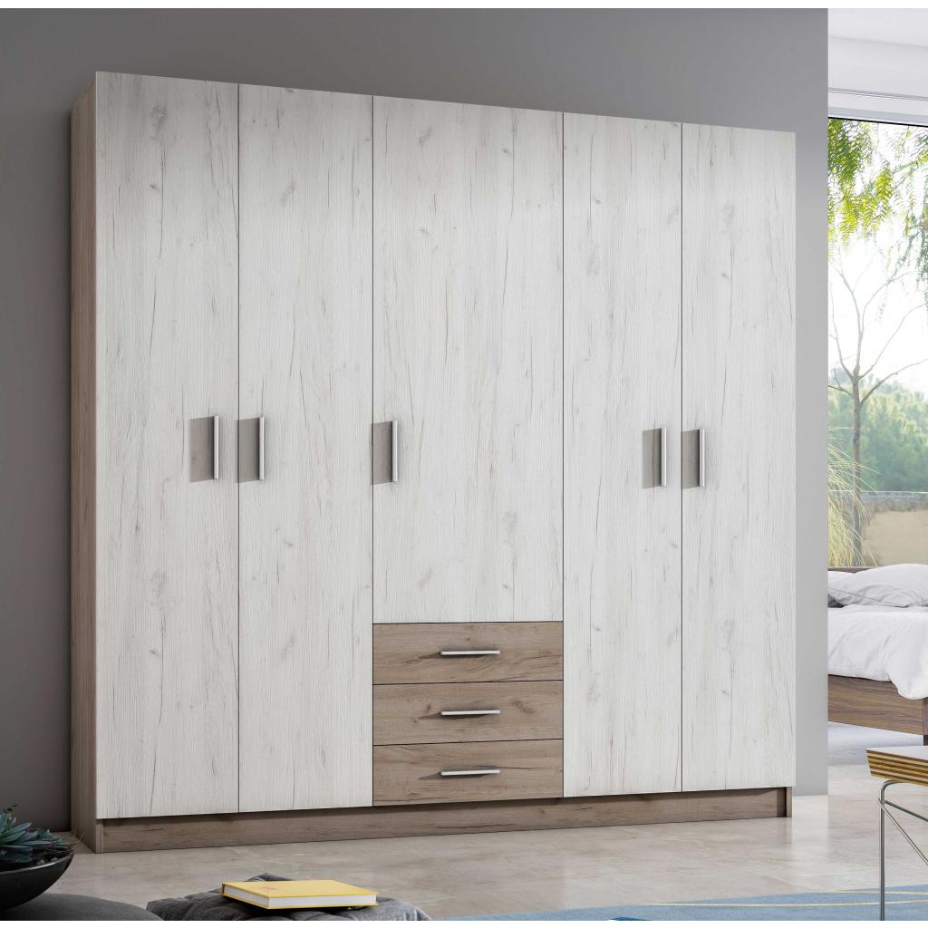 Rebajas Oferta Novedad Armario en Nordik Ref: 175500002329 389,99 € Armario de 5 puertas de 220 cm. de ancho. Interiores en roble. Incluye 2 barras, 5 estantes y 3 cajones.Composición: Tablero de partículas, tablero de fibras, lámina de papel, borde de plástico. Disponibilidad: Color Nordik Tamaño 220x220x50cm Ancho x Alto x Fondo Cantidad