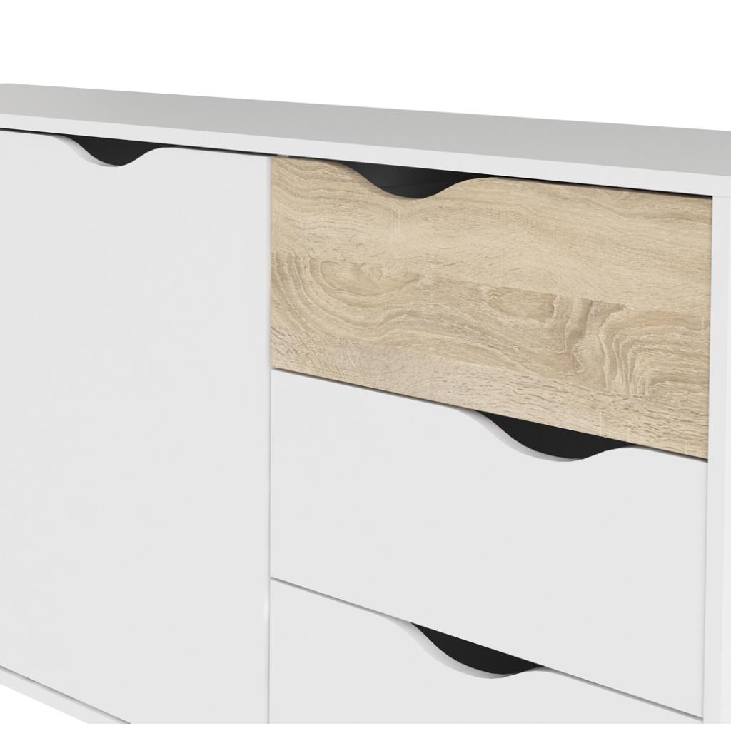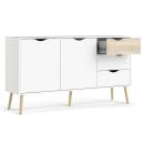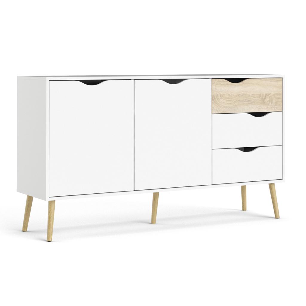 Aparador de atractivo diseño con líneas nórdicas. Pieza en color blanco con detalles en roble y pata de madera maciza en color roble. Gran capacidad con 2 puertas y 3 cajones.