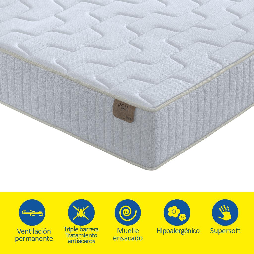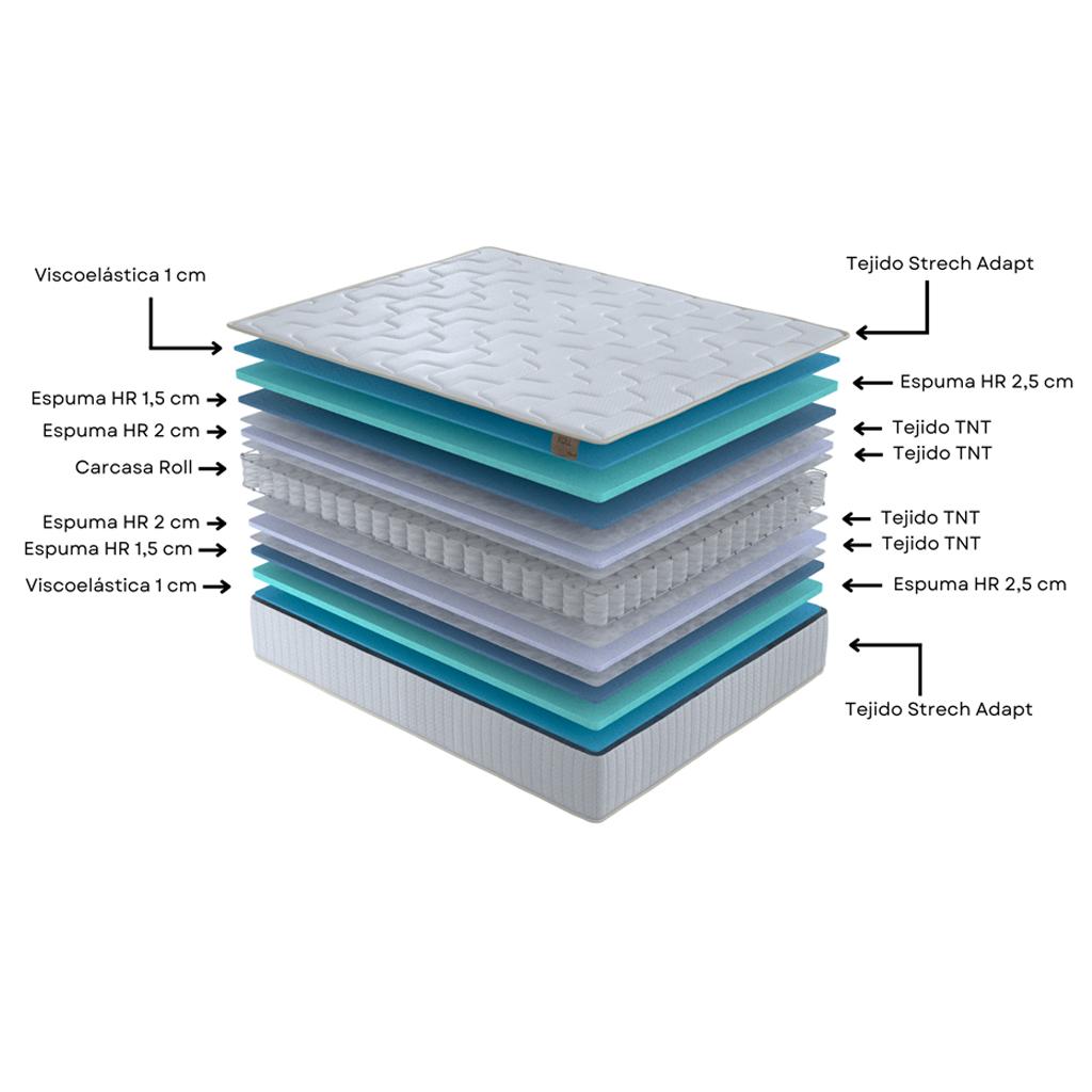 Colchón viscoelástico con muelle ensacado, anatómico y atérmico. Núcleo de muelles ensacados resistentes y ergonómicos, que aportan un descanso firme que facilita los movimientos durante el descanso manteniendo una mejor independencia de lechos. Destaca por su gran resistencia gracias a sus refuerzos perimetrales. Su núcleo favorece la transpiración, impidiendo así la aparición de ácaros y hongos. Transpirable de poro abierto y foam supersuave que aporta el perfecto equilibrio entre la firmeza del muelle y la adaptabilidad de su acolchado para dar como resultado un descanso total. Tejido Strech de alto gramaje certificado según el Standard 100 de Oeko-Tex