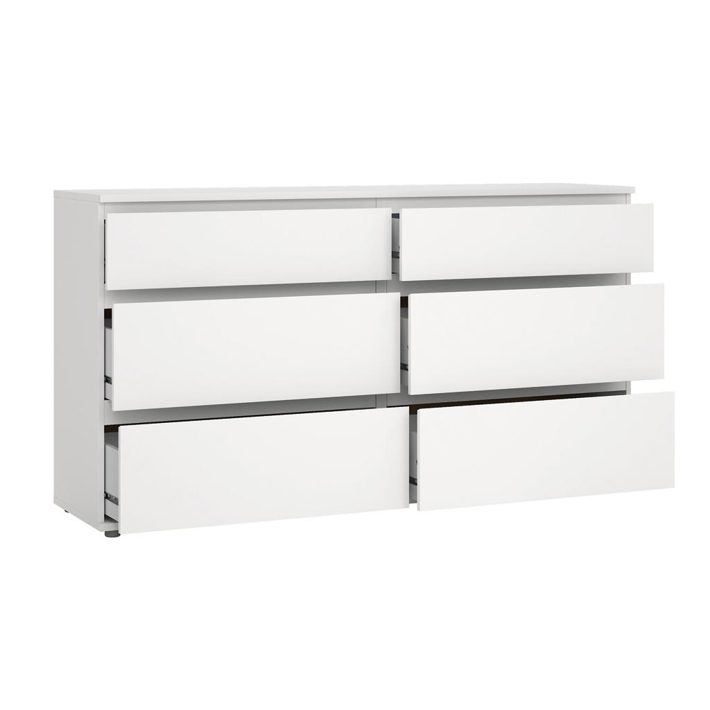 La cómoda doble Nova ofrece un almacenamiento minimalista y funcional, con seis amplios cajones y deslizadores de acero con rodamientos de bolas para facilitar su uso. Su diseño sin tiradores le confiere una estética elegante y moderna, realzando la belleza de la simplicidad.