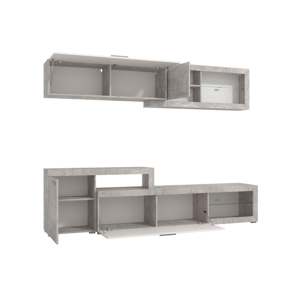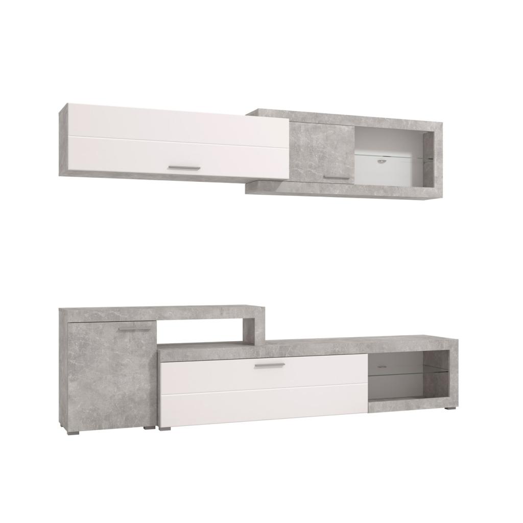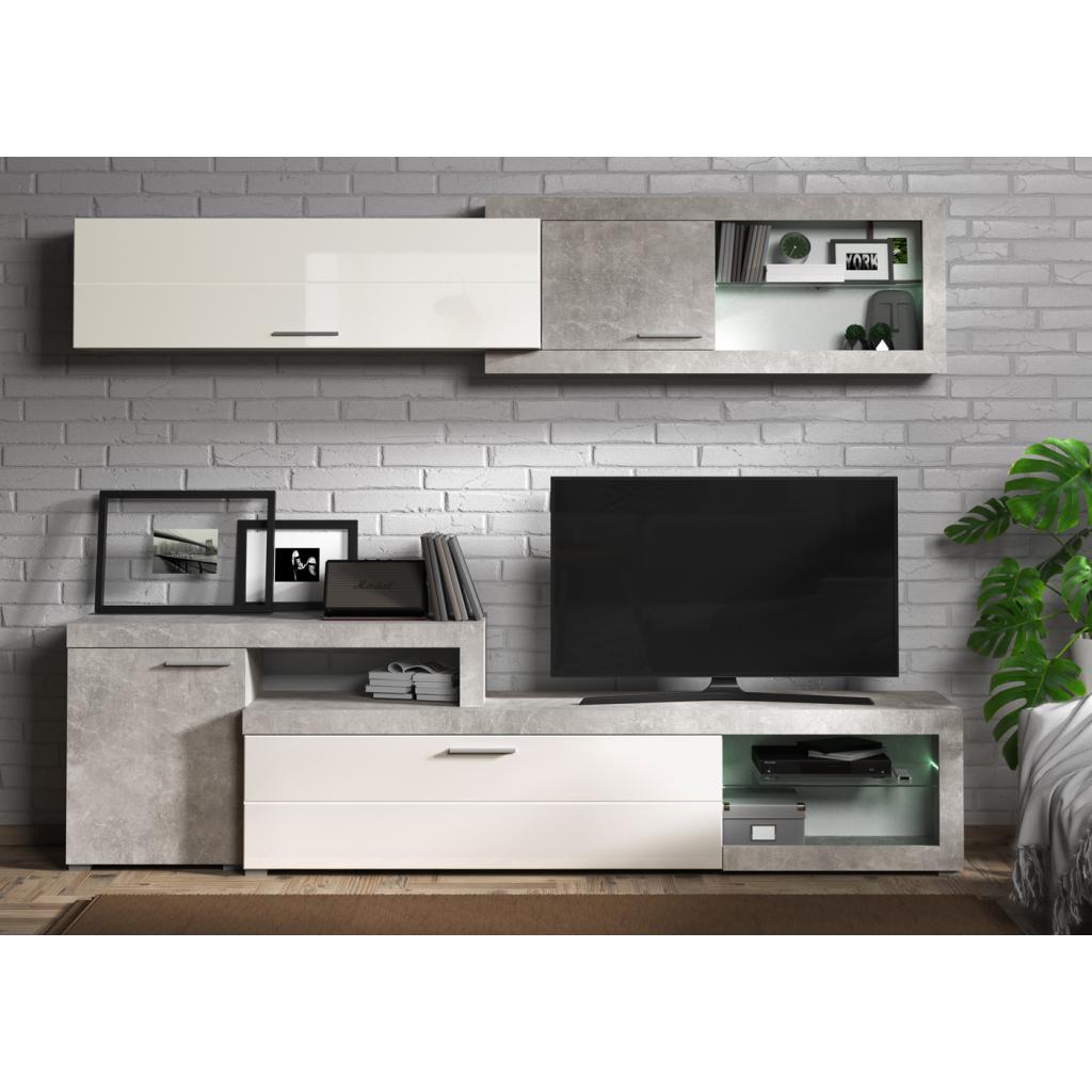 Moderna composición de salón, combinado en blanco brillo y gris cemento. Es ideal para renovar el estilo de casa. Colores de última tendencia. Dispone de dos puertas abatibles. No incluye leds.