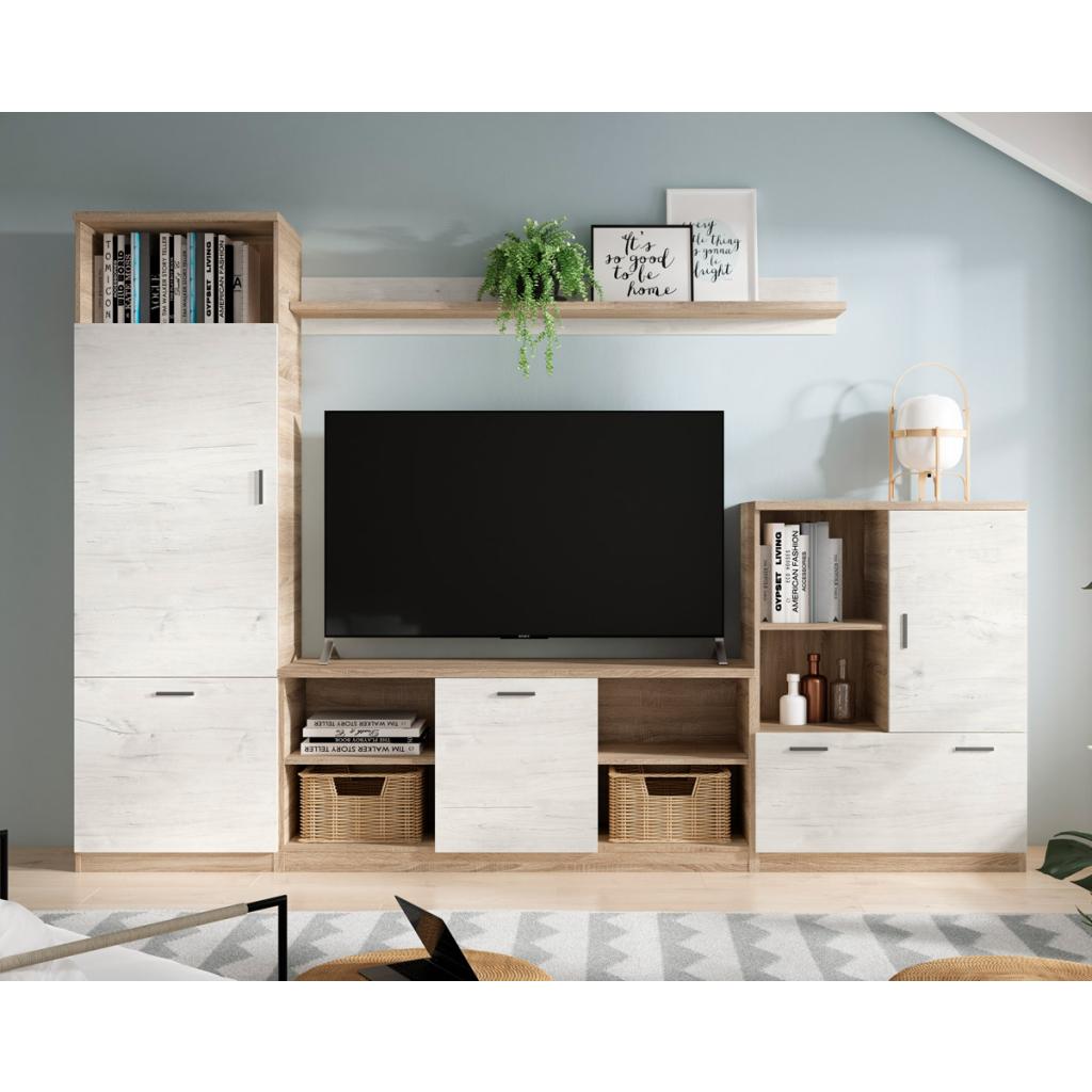 Composición en roble cambrian y nórdico - Roble cambrian y nórdico, Vitrina 60x194x40 cm. Mesa tv 140x60x40 cm. Bodeguero 80x110x40 cm. Estante 170x22x18 cm. Ancho x Alto x Fondo.