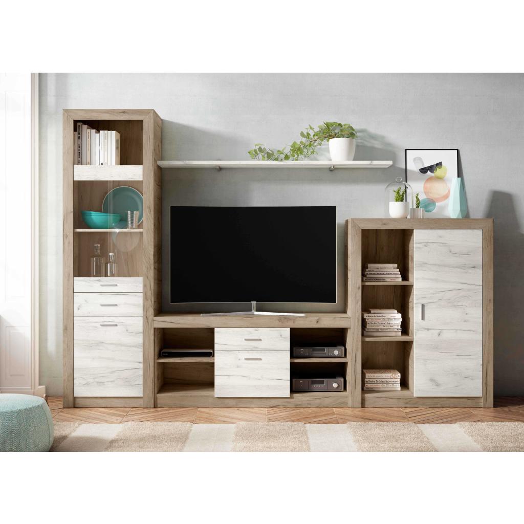Rebajas Oferta Novedad Composición en roble y nordik Ref: 098801000145 499,99 € Composición estilo contemporáneo de color roble y nordik. Formada por vitrina, mesa tv, bodeguero y estante.Composición: Tablero de partículas, tablero de fibras, lámina de papel, borde de plástico, vidrio templado. Disponibilidad: Color roble y nordik Tamaño Vitrina 60x197x40 Mesa Tv 130x60x40 Bodeguero 94x125x40 Estante 160x2x25 cm Ancho x Alto x Fondo. Cantidad