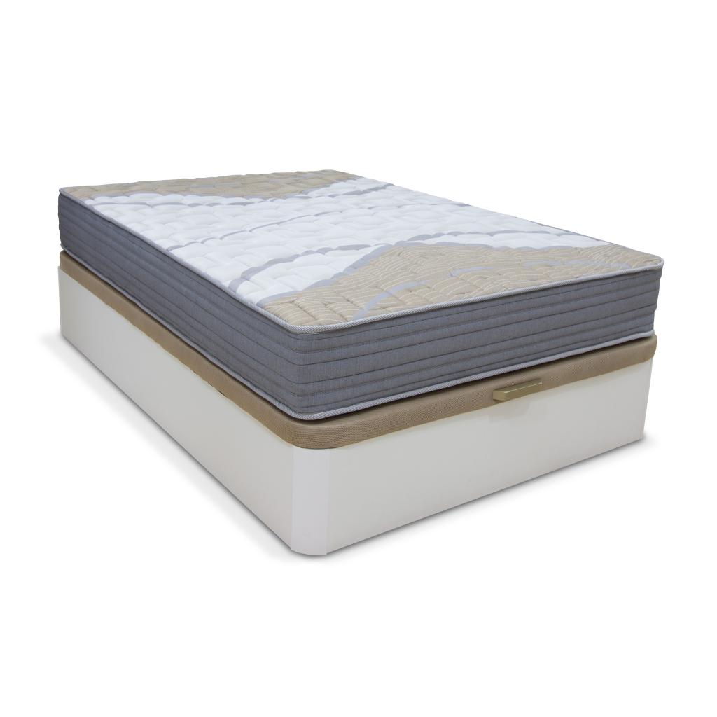 Base tapizada en tejido 3D color beige que asegura la transpirabilidad y circulación del aire. Reforza de gran resistencia, con tirador embutido Tablero de partículas compactado con perforaciones circulares para permitir la transpirabilidad del colchón.