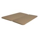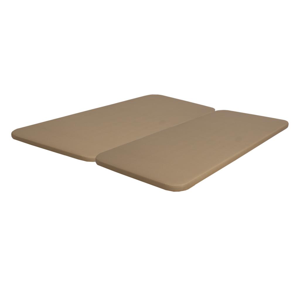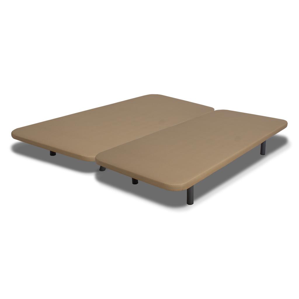Conjunto de 2 bases tapizadas en tejido 3D color beige con pletinas de unión de medida total 200x200 cms.. Estructura construida en hierro, reforzada para evitar dobleces con inserciones a rosca para acoplar las patas. Preparada para 4 patas en medidas individuales y para 6 patas en medidas matrimoniales. Tablero de partículas compactado de gran resistencia con perforaciones circulares para permitir la transpirabilidad del colchón. No incluye patas
