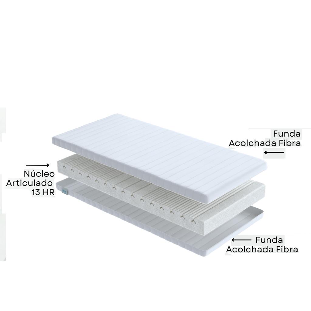 Colchón articulado con 5 zonas de confort y descanso diferenciadas. Núcleo Eliocel de poliuretano de gran elasticidad y viscoelástica de gran adaptabilidad transpirable de poro abierto con canales horizontales que favorecen la ventilación impidiendo así la aparición de ácaros y humedades. Articulación suave sin ejercer puntos de presión por la estructura de su núcleo. Funda acolchada en fibra con cremallera. Tejido certificado según el Standard 100 de Oeko-Tex. Se presenta en formato enrollado con bolsa de plástico y caja de cartón para su fácil transporte