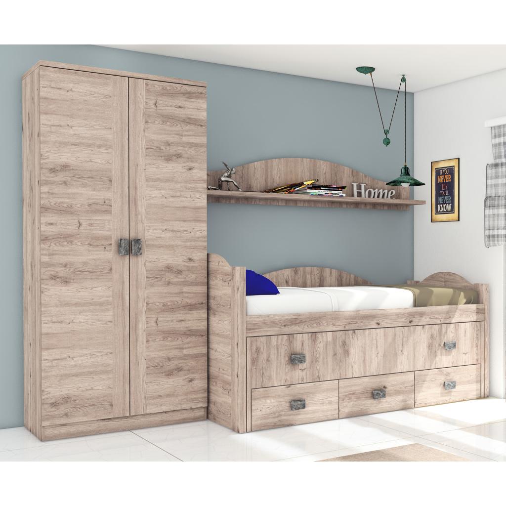 Dormitorio juvenil completo en color roble. Llamativa combinación unisex y muy versátil. Compuesto por cama compacta, estante y armario. Cama superior de 90*190 y cama inferior extraible 90*180. No incluye somier ni colchón