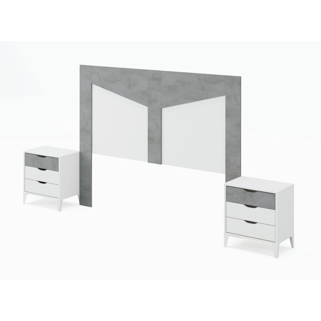 Rebajas Oferta Novedad Dormitorio de matrimonio Ref: 015400000553 194,99 € Dormitorio de matrimonio moderno y versátil, compuesto por cabecero (2 posiciones) y 2 mesistas en color blanco y cemento.Composición: Tablero de partículas, tablero de fibras, lámina de papel, borde de plástico. Disponibilidad: Color Blanco / Cemento Tamaño Cabecero 160x132x3 cm Mesitas 44x50x33 cm Ancho x Alto x Fondo Cantidad