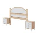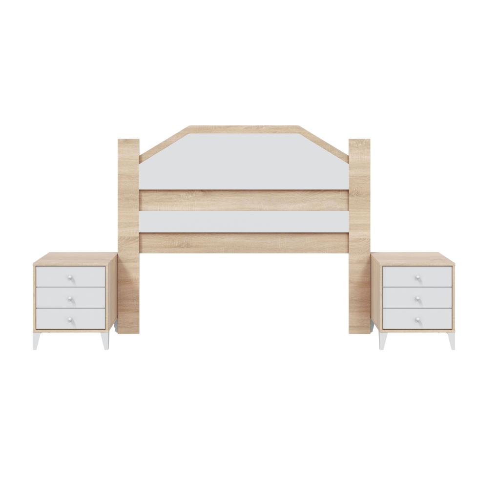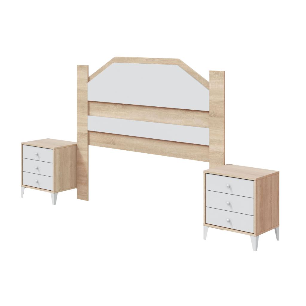 Rebajas Oferta Novedad Dormitorio de Matrimonio Ref: 015400000562 199,99 € Cabecero para cama de 160/150/140 con dos mesitas de tres cajones. Composición: Tablero de partículas, tablero de fibras, lámina de papel, borde de plástico. Disponibilidad: Color Roble Canadian / Blanco Tamaño Cabecero 156x129x3 cm Mesita 44x50x33 cm Ancho x Alto x Fondo Cantidad