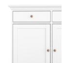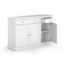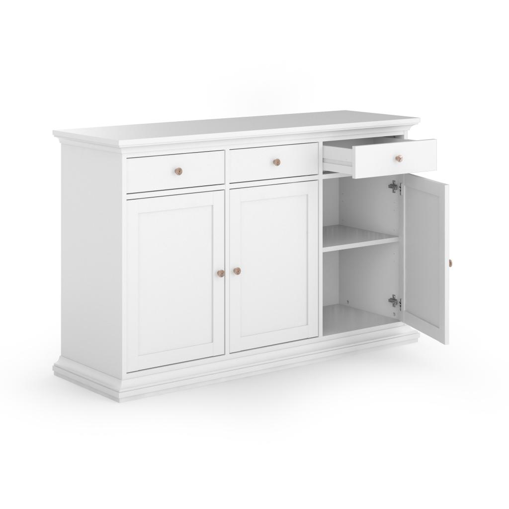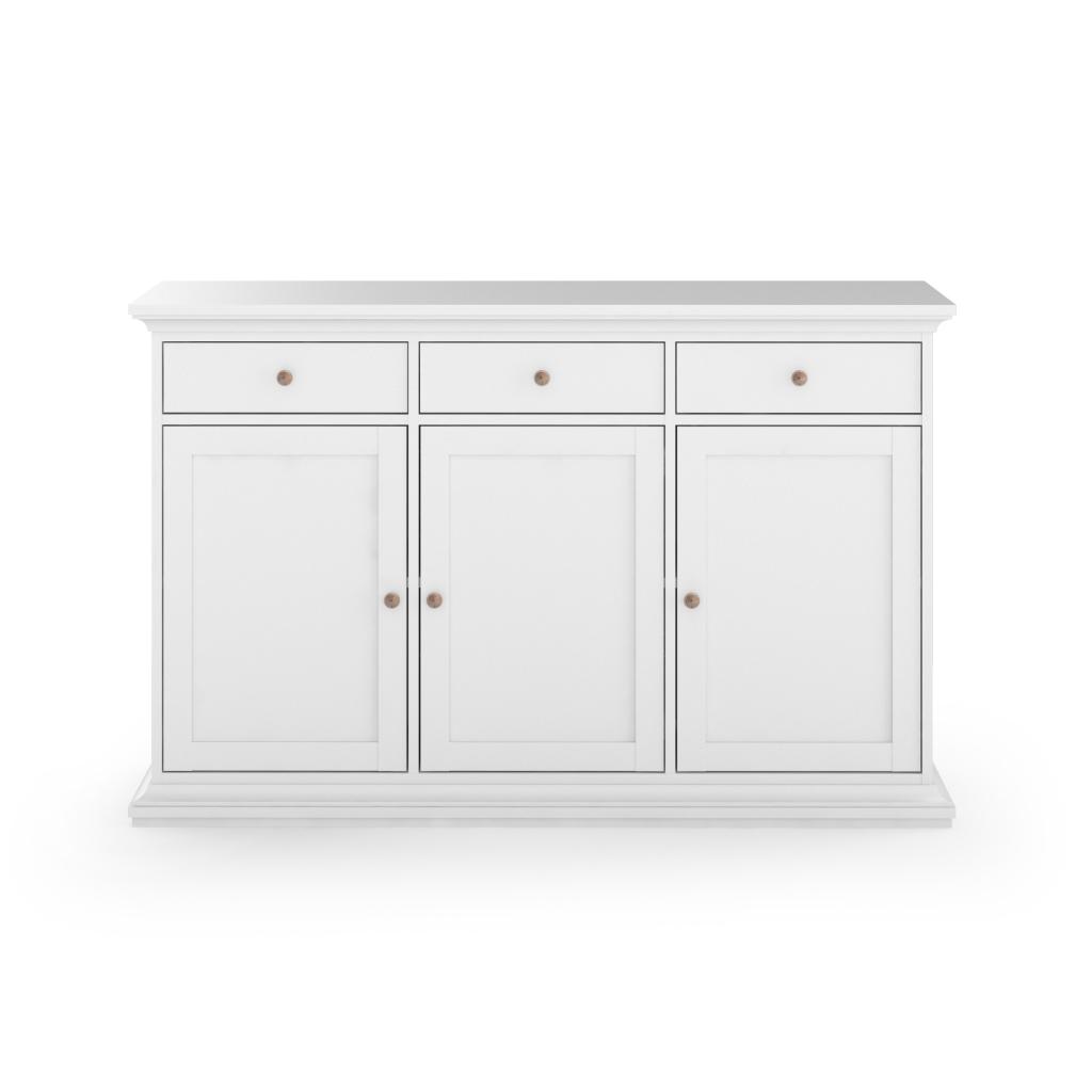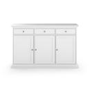 Aparador con un elegante diseño y estilo neoclásico en color blanco. Dispone de 3 puertas y 3 cajones de gran capacidad. Incluye 3 estantes en su interior.