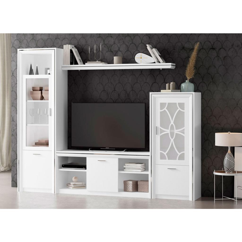 Elegante composición de salón formada por una vitrina, mesa TV, bodeguero con celosia y estante. Resalta por su elegancia y sencillez. Puede añadir el aparador a juego (opcional) 206500000190. Decorada con una línea decorativa en plata.