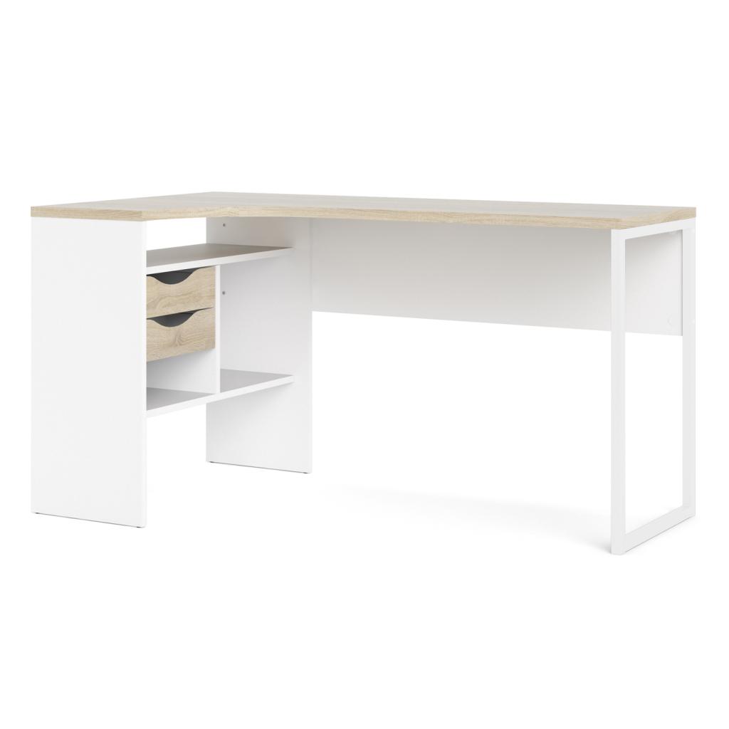 Mesa de escritorio de estilo nórdico, en color blanco y roble. Con pata metálica, 2 cajones y 2 estantes. Su ángulo es ideal para adaptarse a cualquier espacio del hogar.