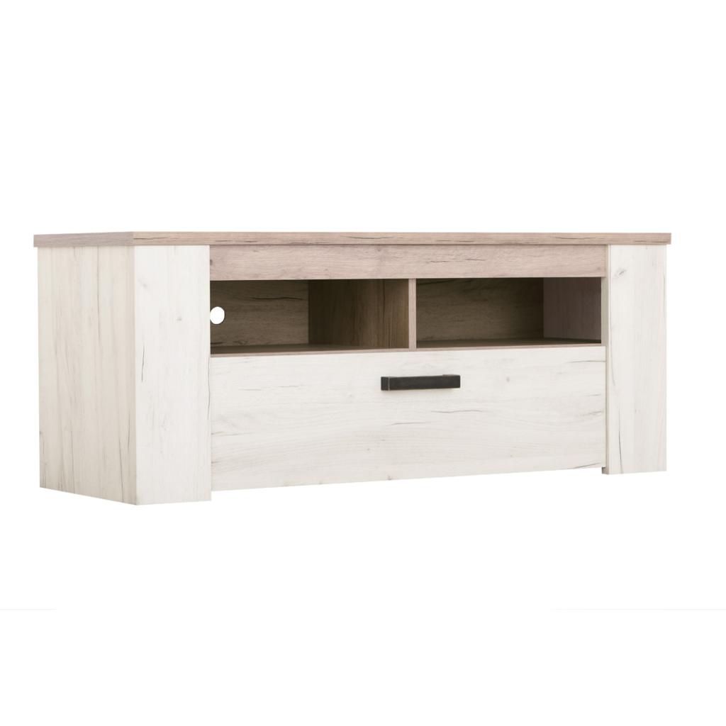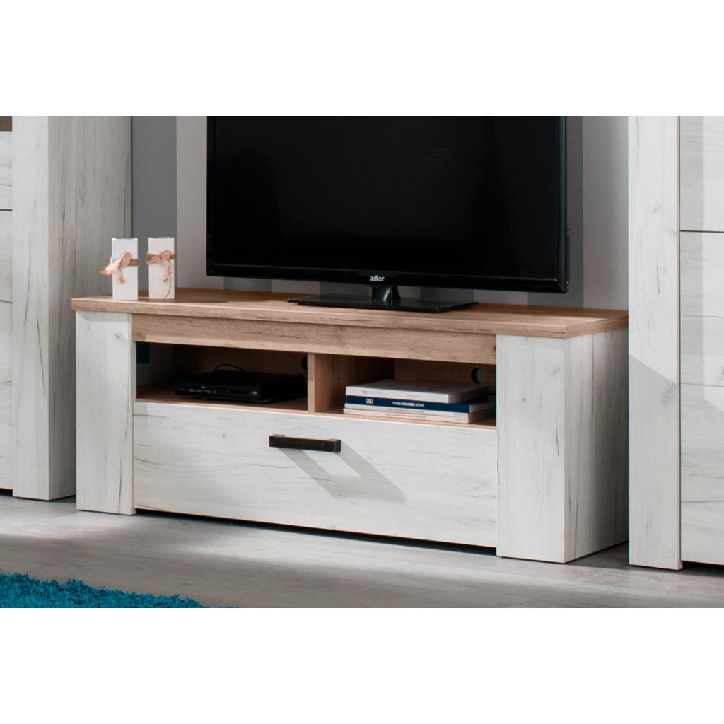 Mesa TV mod. Kent en blanco vintage - Blanco vintage y roble grisaceo, 122x49x43 cm Ancho x Alto x Fondo