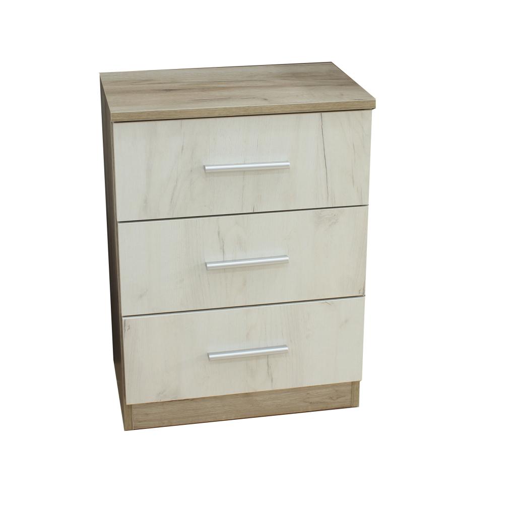 Rebajas Oferta Novedad Mesita de noche Ref: 188700000078 39,99 € Moderna mesita en nordik y roble. Cuenta con 3 cajones. Tiradores color aluminioComposición: Tablero de partículas, tablero de fibras, lámina de papel, borde de plástico. Disponibilidad: Color Roble / Nordilk Tamaño Mesita 46x64x29,5 cm Ancho x Alto x Fondo Cantidad