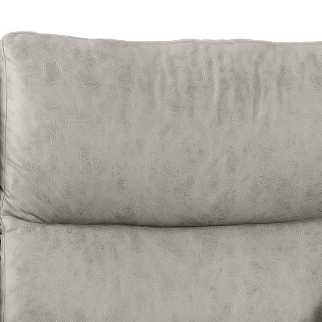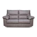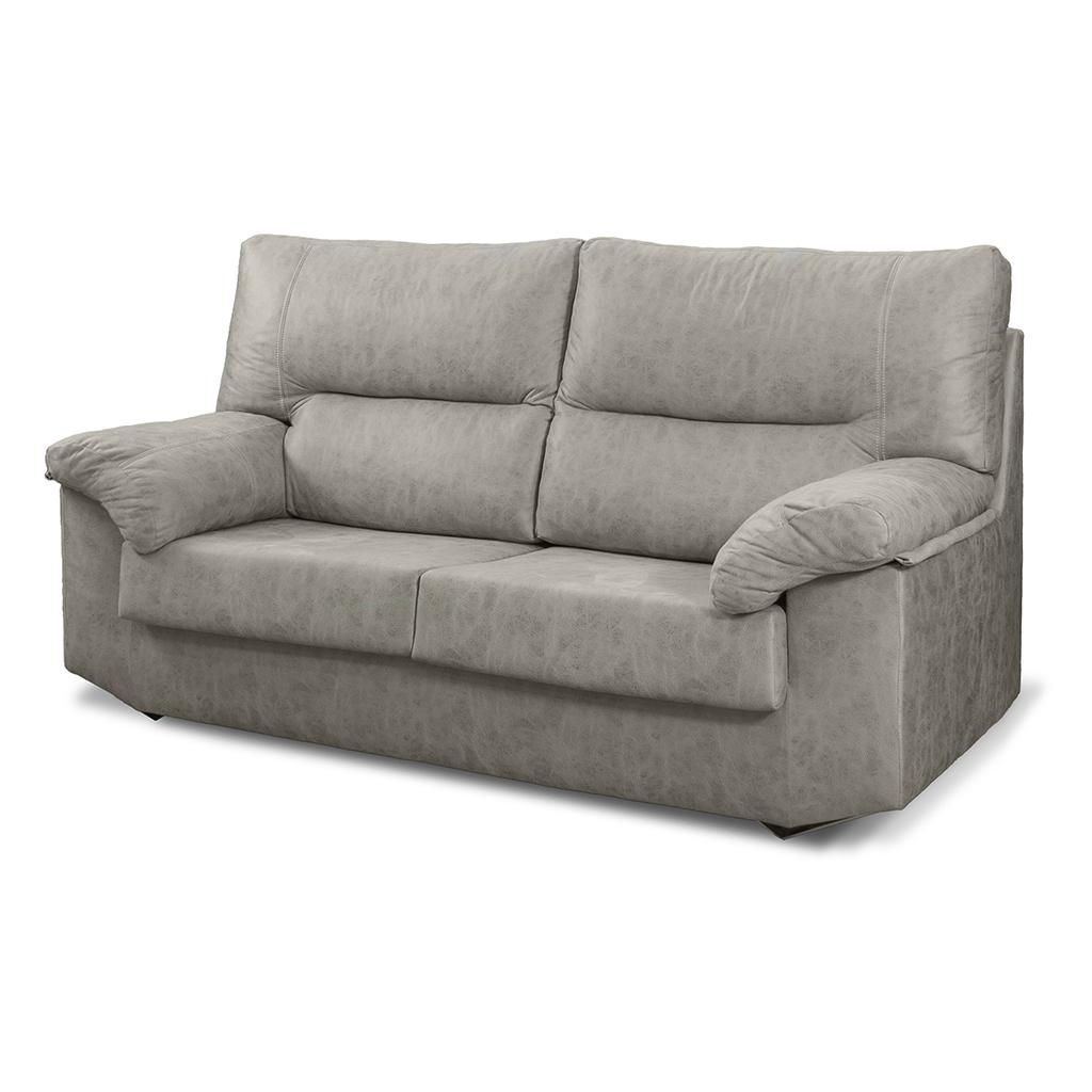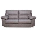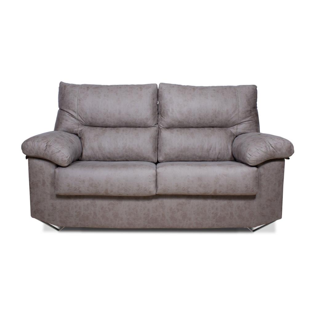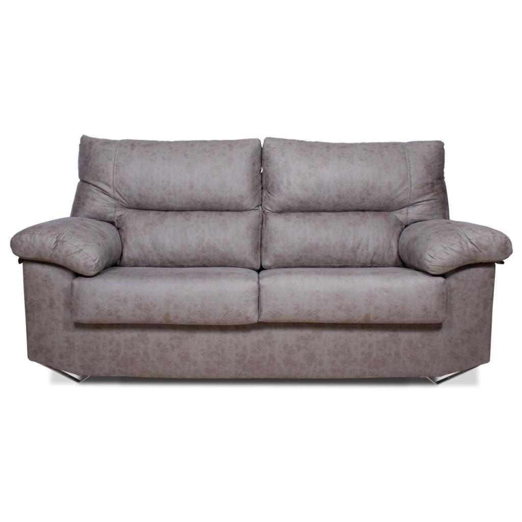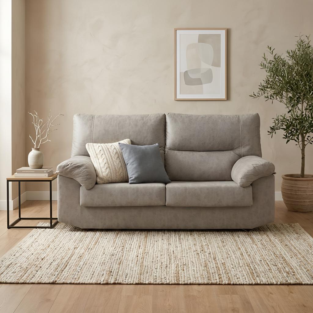 Sofá de línea moderna con patas metálicas. Tapizado en color gris cemento en tejidos de gran resistencia y fácil limpieza con costuras decorativas.