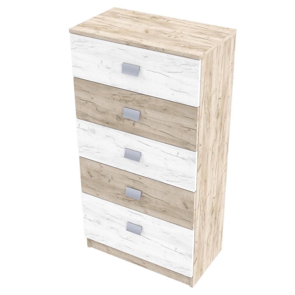 Rebajas Oferta Novedad Sinfonier 5 cajones en roble nordik Ref: 193600000133 144,99 € Sinfonier de 5 cajones en roble nordik. Puede combiarlo con el dormitorio 175500002219.Composición: Tablero de partículas, tablero de fibras, lámina de papel, borde de plástico. Disponibilidad: Color Roble nordik Tamaño 60x117x34 cm. Ancho x Alto x Fondo Cantidad