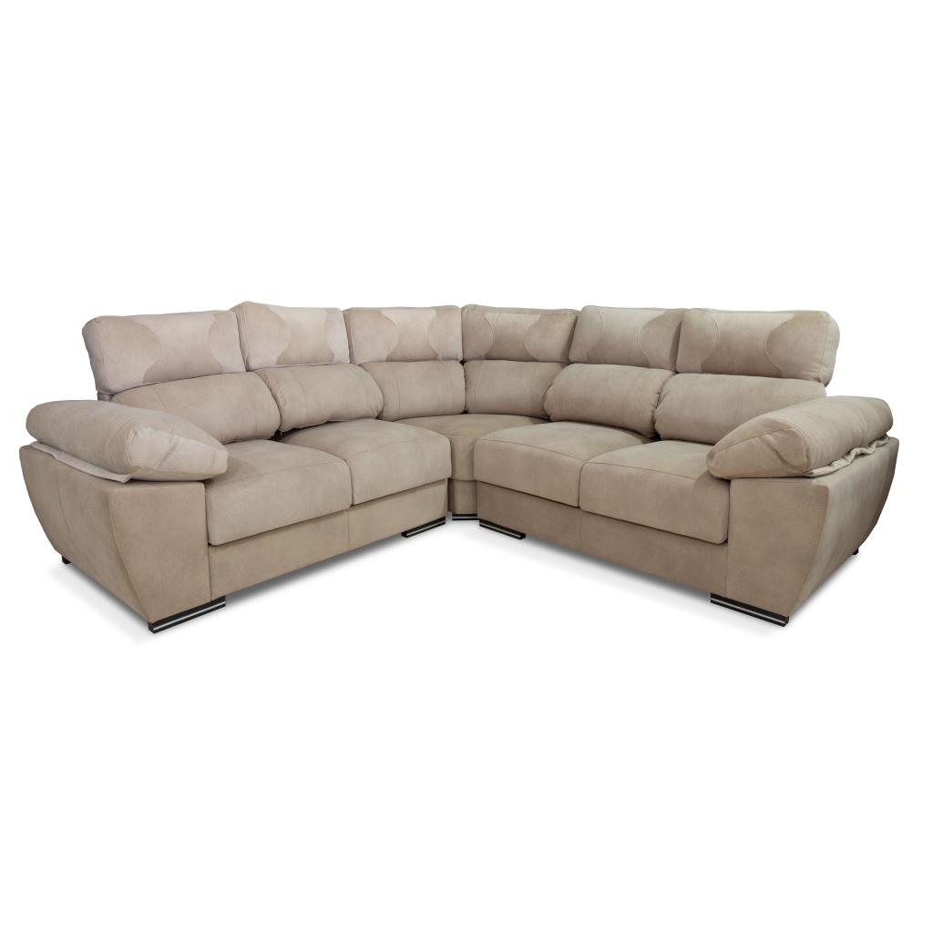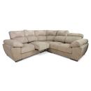 Sofá rinconera de color camel tapizado en tejido antimanchas. Con sus 4 plazas extraibles y cabezales reclinables, podréis disfrutar en familia de la televisión y de vuestros momentos de ocio.
