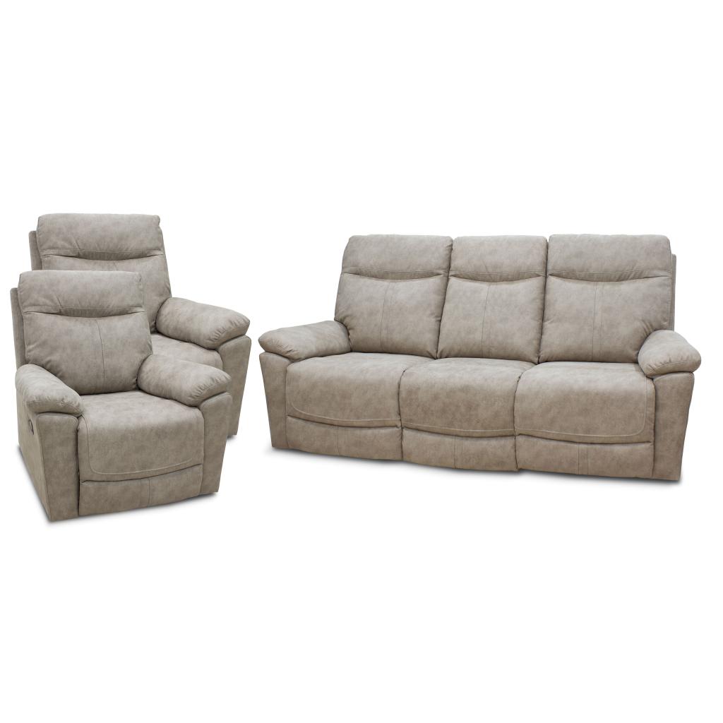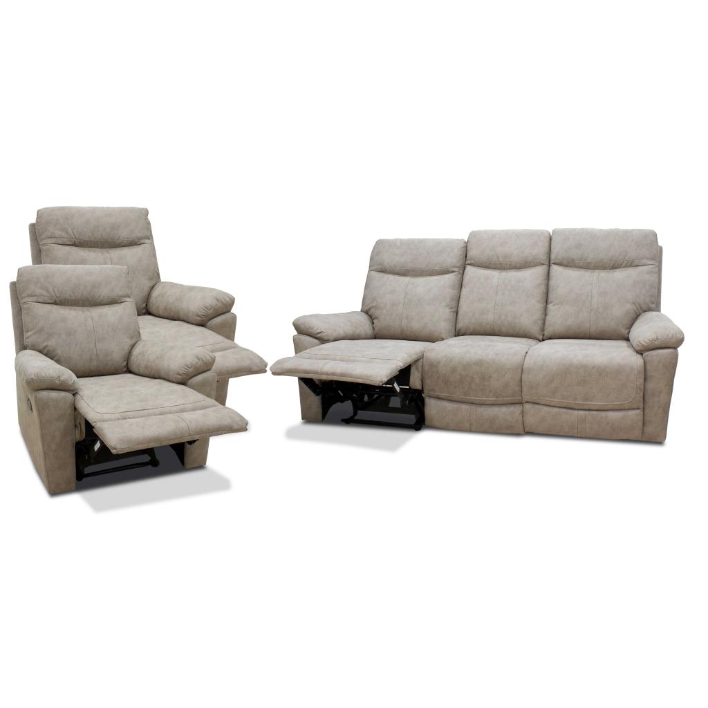Rebajas Oferta Novedad Tresillo Relax Ref: 204000000089 899,99 € Sofá 3 plazas y 2 sillones con sistemas relax manual de alta calidad. Composición: Pino macizo, acero, revestimiento de poliéster en polvo, tablero de partículas, poliuretano, poliéster desmenuzado, fibras de poliéster, tejido 100% poliéster. Disponibilidad: Color Gris Tamaño Sofá 3 plazas 196x100x93 cm Sillón 88x100x93 Cm Ancho x Alto x Fondo Cantidad