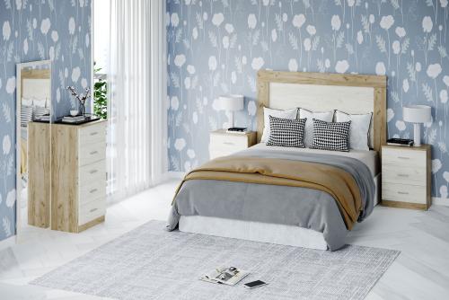 Ver detalles Dormitorio de matrimonio 299,99 € Color roble y nordik Tamaño Mesita 46x64x29.5 Cabecero 158.5x130x3 Sinfonier 46x103x35 Espejo 161x50 cm Ancho x Alto x Fondo Cantidad Ver detalles