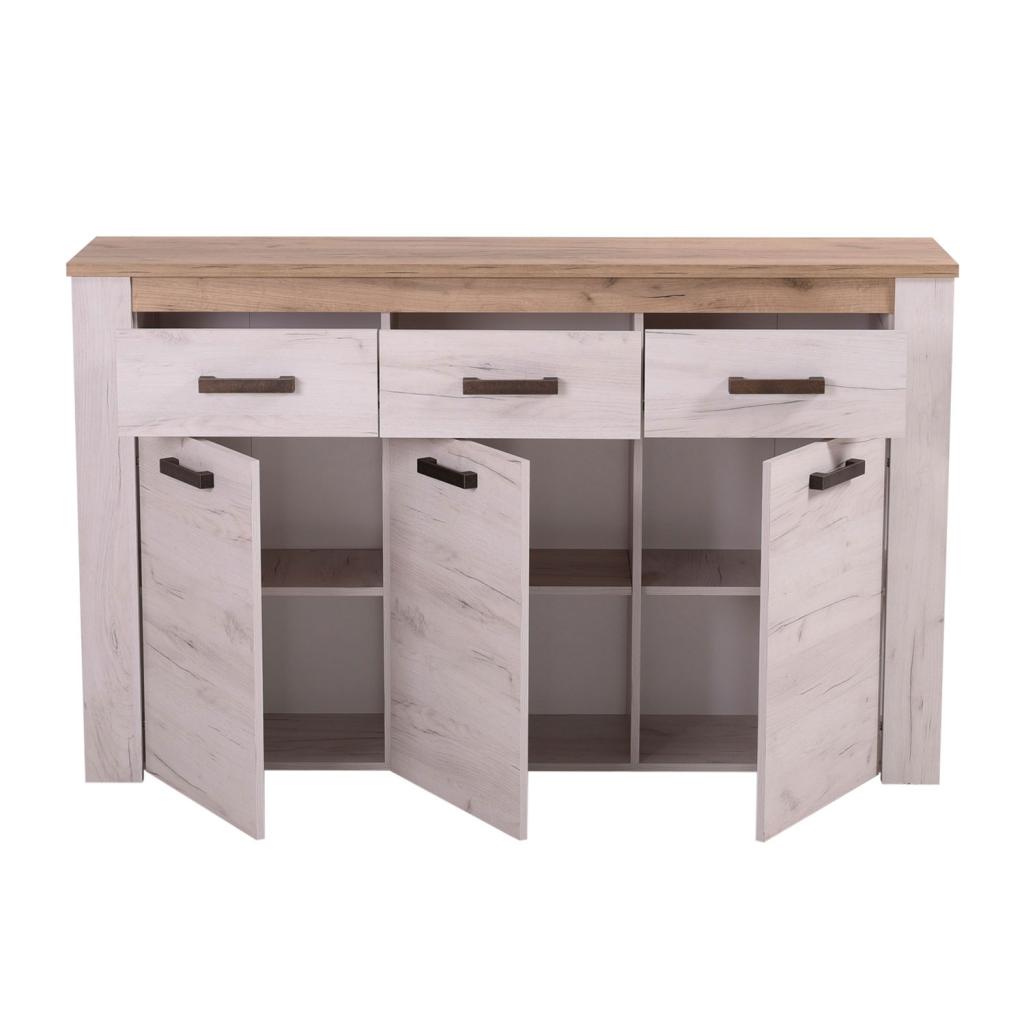 Rebajas Oferta Novedad Aparador Kent con 3 puertas y 3 cajones Ref: 212500000016 219,99 € Este aparador es una pieza única, cuenta con un diseño moderno de líneas rectas. Dispone de 3 puertas y 3 cajones con gran capacidad de almacenaje.Composición: Tablero de partículas, tablero de fibras, lámina de papel, borde de plástico. Disponibilidad: Color Blanco vintage y roble grisaceo Tamaño 160x98x36.5 cm Ancho x Alto x Fondo Cantidad