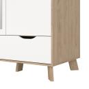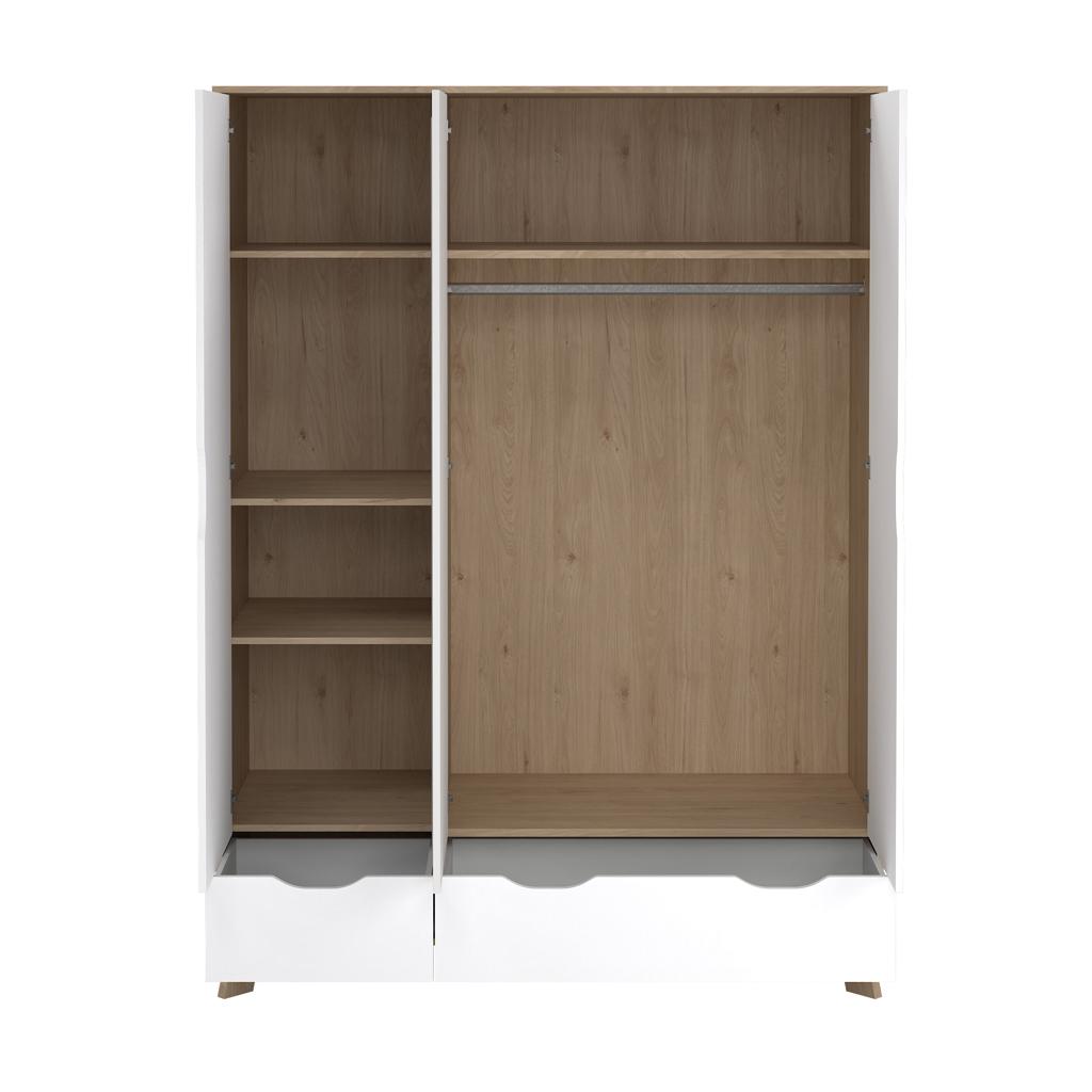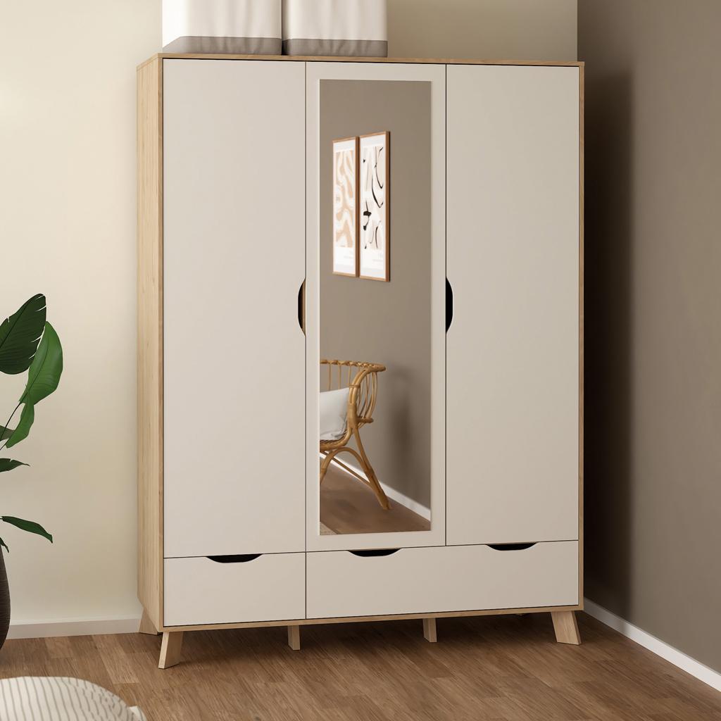 El armario Ikast, una combinación de diseño único y colores vibrantes. Con tres puertas, una de ellas con un práctico espejo, incluyendo dos estantes ajustables, dos estantes fijos y tres cajones. Completo con barra para ropa, este armario combina estilo y funcionalidad, ofreciendo amplio espacio para todas tus prendas esenciales.