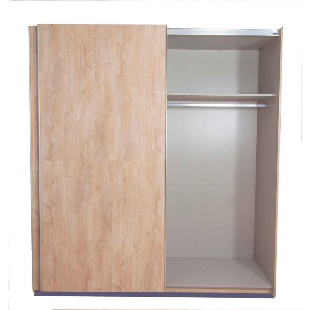 Armario de 2 puertas correderas de 200 cm. de ancho. Diseño moderno y funcional con herrajes metálicos acabado en blanco. Interiores en blanco. Incluye 2 barras y 2 estantes altillo. Compatible con cajonera 184100000407, opcional.