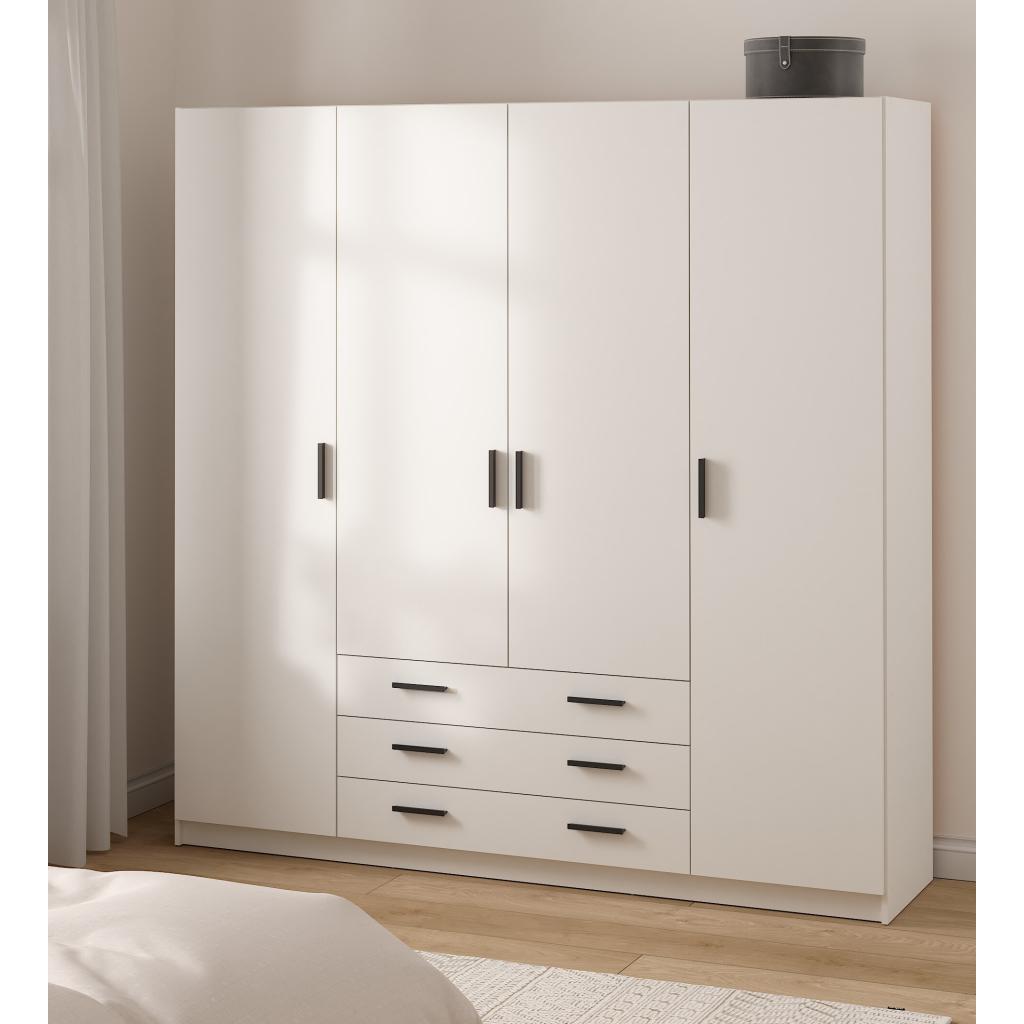 El armario Sprint es una solución de almacenamiento funcional y espaciosa con cuatro puertas abatibles, una barra para ropa y tres cajones. Incluye ocho estantes, seis ajustables y dos fijos, que ofrecen una organización versátil para tu ropa y objetos esenciales. Diseñado para ser práctico, es perfecto para cualquier hogar moderno.