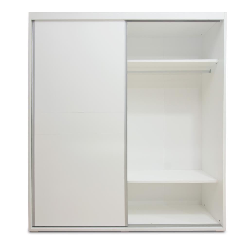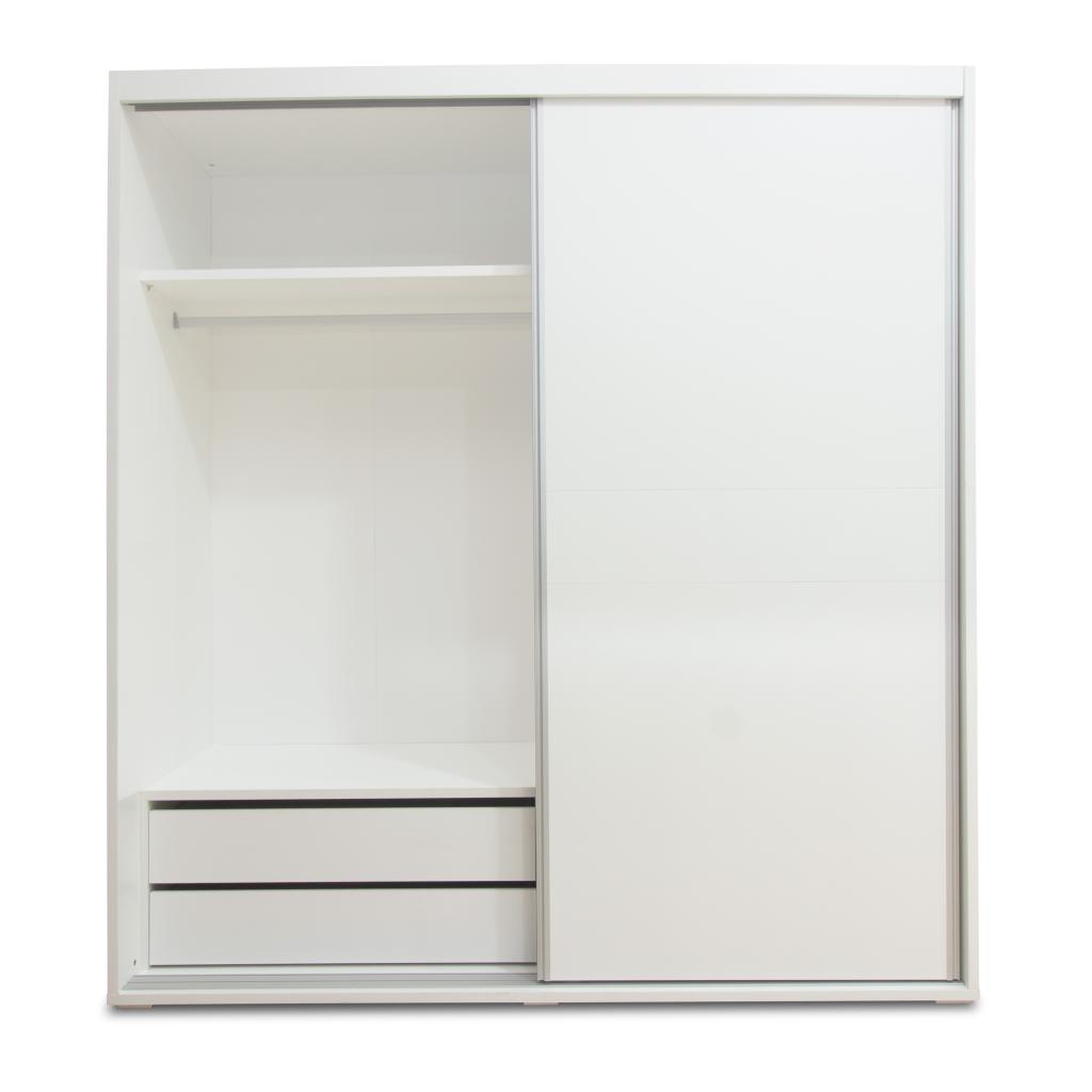 Armario de 2 puertas correderas con cajonera incluida. Cuenta con un diseño moderno y funcional. Acabado en blanco poro. Incluye 2 barras, 3 estantes + cajonera.