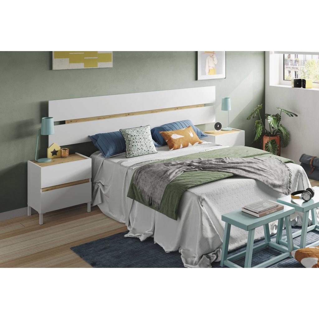 Rebajas Oferta Novedad Cabecero de matrimonio con 2 mesitas Ref: 015400000504 149,99 € Conjunto de cabecero y dos mesitas de dos cajones diseño urbano en color blanco artik y roble. Cabecero adaptado para cama de 135 cm/ 150 cmComposición: Tablero de partículas, tablero de fibras, lámina de papel, borde de plástico. Disponibilidad: Color Blanco Artik / Roble Tamaño Cabecero 216x47.5x1,5 Mesitas de noche 49,5x53x34,5 cms Ancho x Alto x Fondo Cantidad
