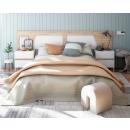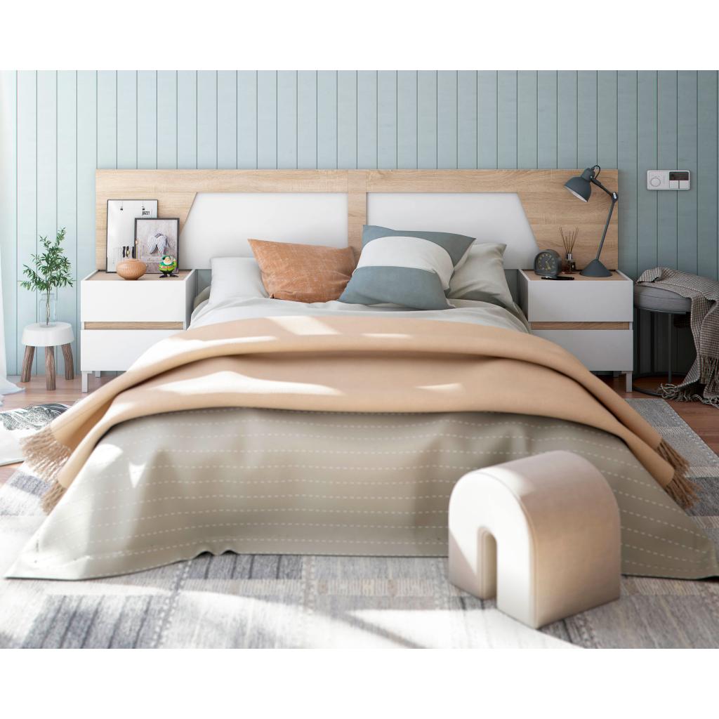 Rebajas Novedad Cabecero de matrimonio con 2 mesitas Ref: 015400000561 179,99 € Cabecero para cama de 160/150/140cm con dos mesitas de dos cajones y cada una con cuatro patas. Composición: Tablero de partículas, tablero de fibras, lámina de papel, borde de plástico. Disponibilidad: Color Roble Canadian/Blanco Artik Tamaño Cabecero 260x50x3 cm Mesitas 50x53x35 cm Ancho x Alto x Fondo Cantidad