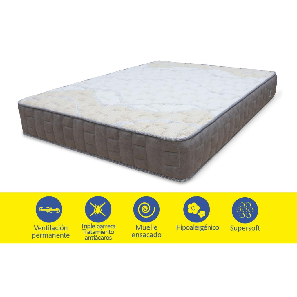 Colchón muelle ensacado, anatómico y atérmico. Núcleo de muelles ensacados resistentes y ergonómicos, que aportan un descanso firme que facilita los movimientos durante el descanso manteniendo una mejor independencia de lechos. Destaca por su gran resistencia gracias a sus refuerzos perimetrales. Su núcleo favorece la transpiración, impidiendo así la aparición de ácaros y hongos. Transpirable de poro abierto y foam supersuave que aporta el perfecto equilibrio entre la firmeza del muelle y la adaptabilidad de su acolchado para dar como resultado un descanso total. Tejido Strech de alto gramaje certificado según el Standard 100 de Oeko-Tex