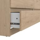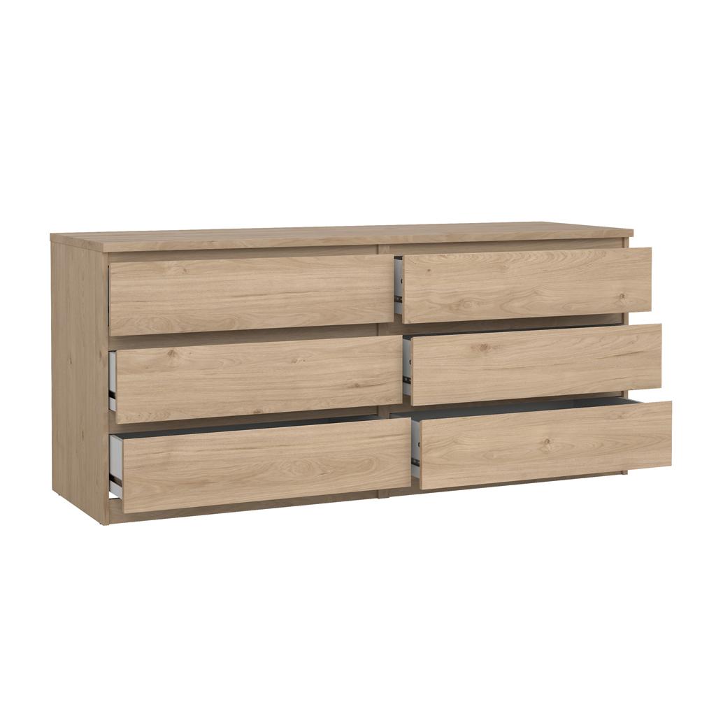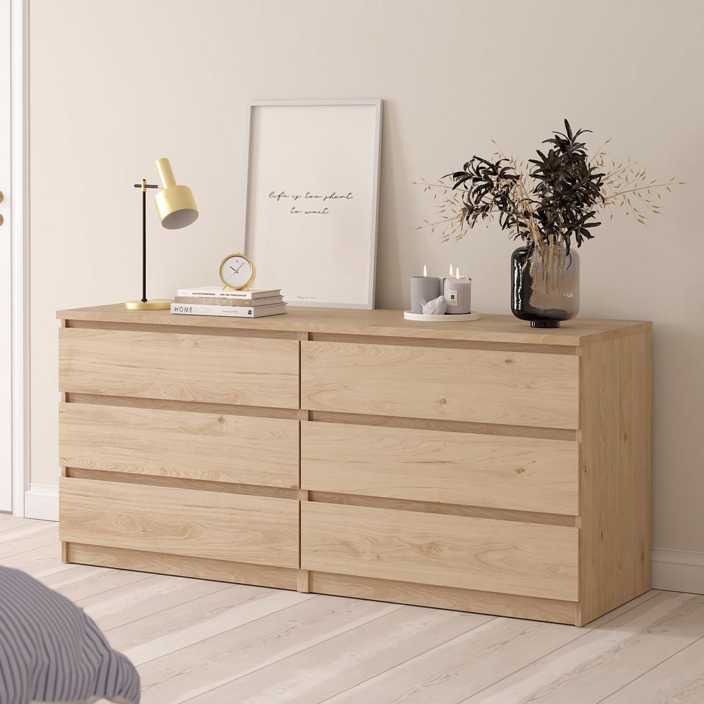 La cómoda doble Naia ofrece un almacenamiento minimalista y funcional, con seis cajones amplios y guías de acero con rodamientos de bolas para mayor comodidad. Su diseño sin tiradores aporta un toque limpio y moderno, realzando la simplicidad.