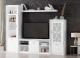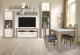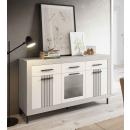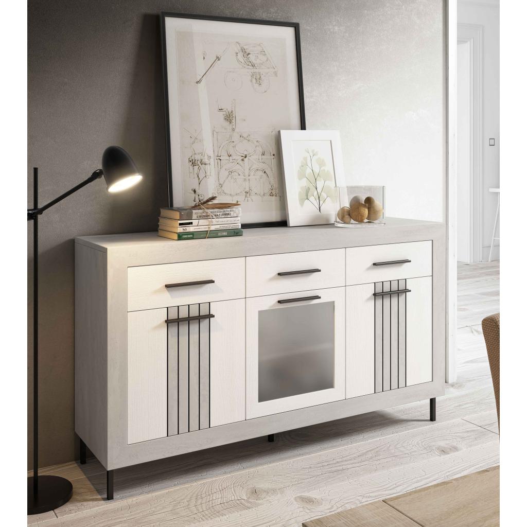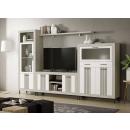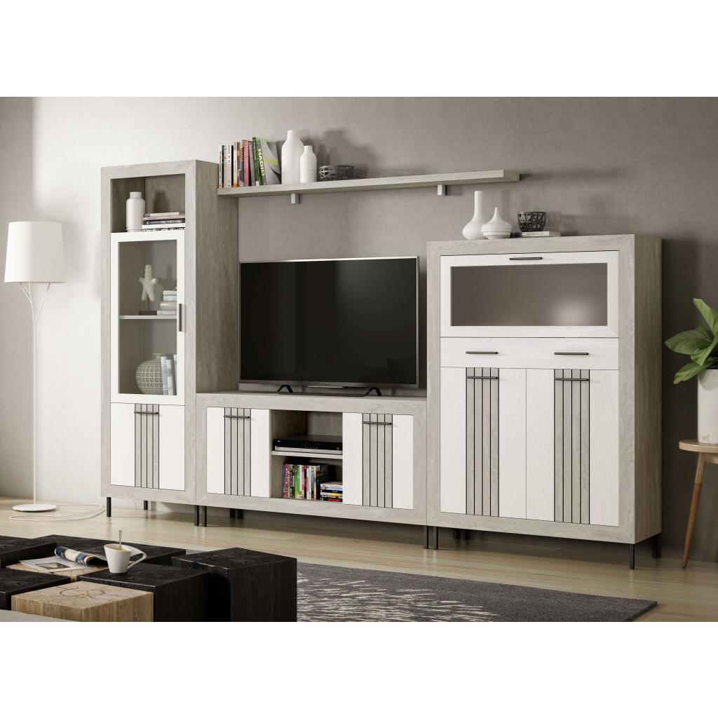 Elegante composición con detalles rayados, en color gris y blanco con patas de metal. Formado por vitrina, mesa Tv, bodeguero y estante. Puede añadir el aparador a juego 175500002271