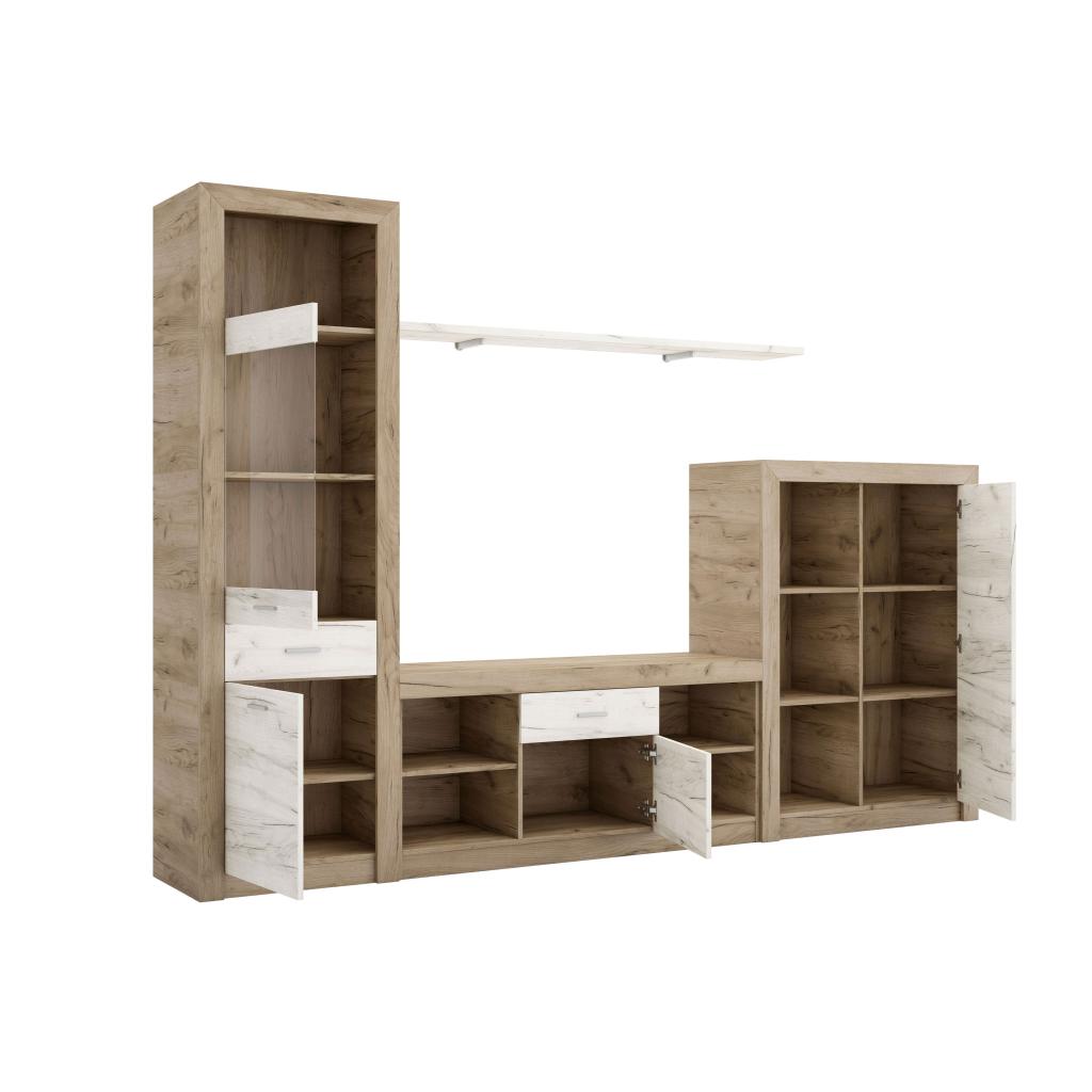 Rebajas Oferta Novedad Composición en roble y nordik Ref: 098801000145 499,99 € Composición estilo contemporáneo de color roble y nordik. Formada por vitrina, mesa tv, bodeguero y estante.Composición: Tablero de partículas, tablero de fibras, lámina de papel, borde de plástico, vidrio templado. Disponibilidad: Color roble y nordik Tamaño Vitrina 60x197x40 Mesa Tv 130x60x40 Bodeguero 94x125x40 Estante 160x2x25 cm Ancho x Alto x Fondo. Cantidad