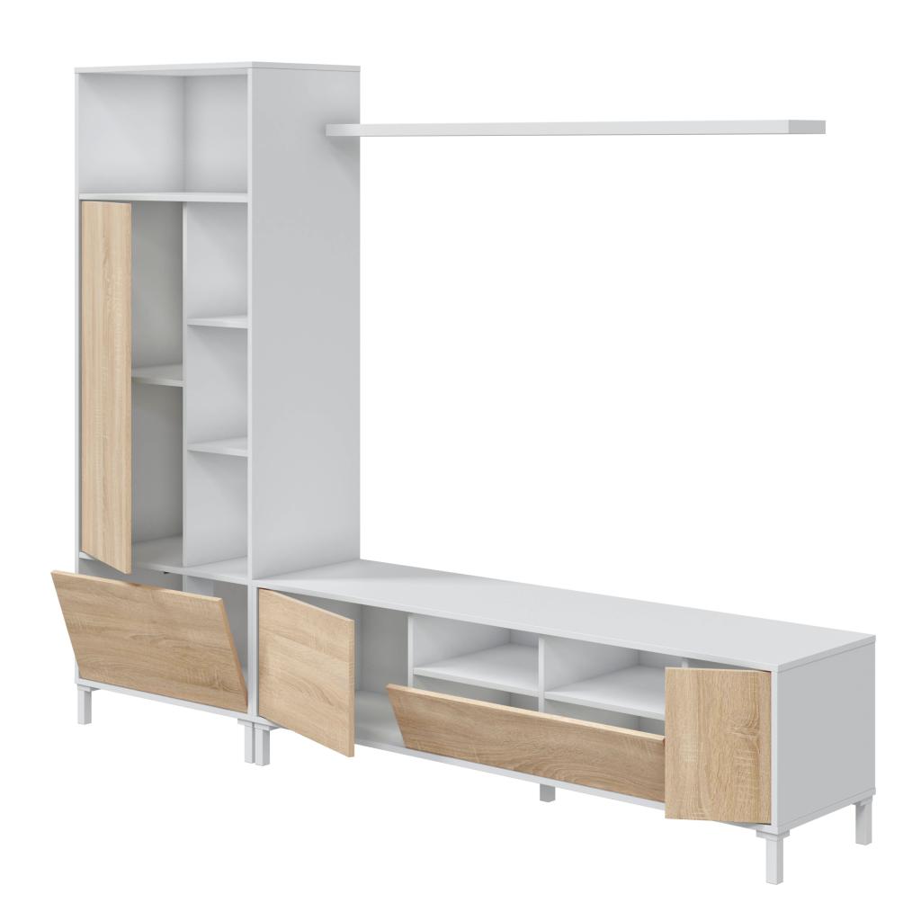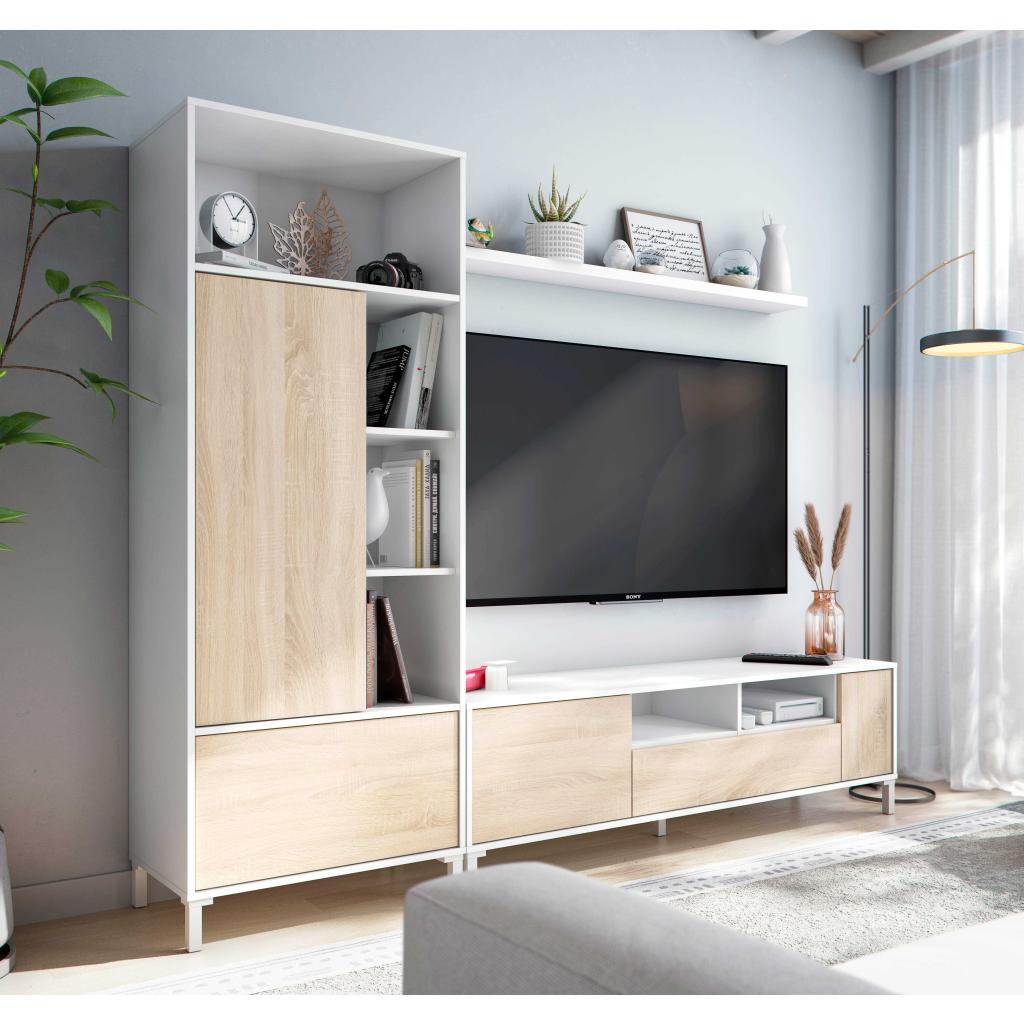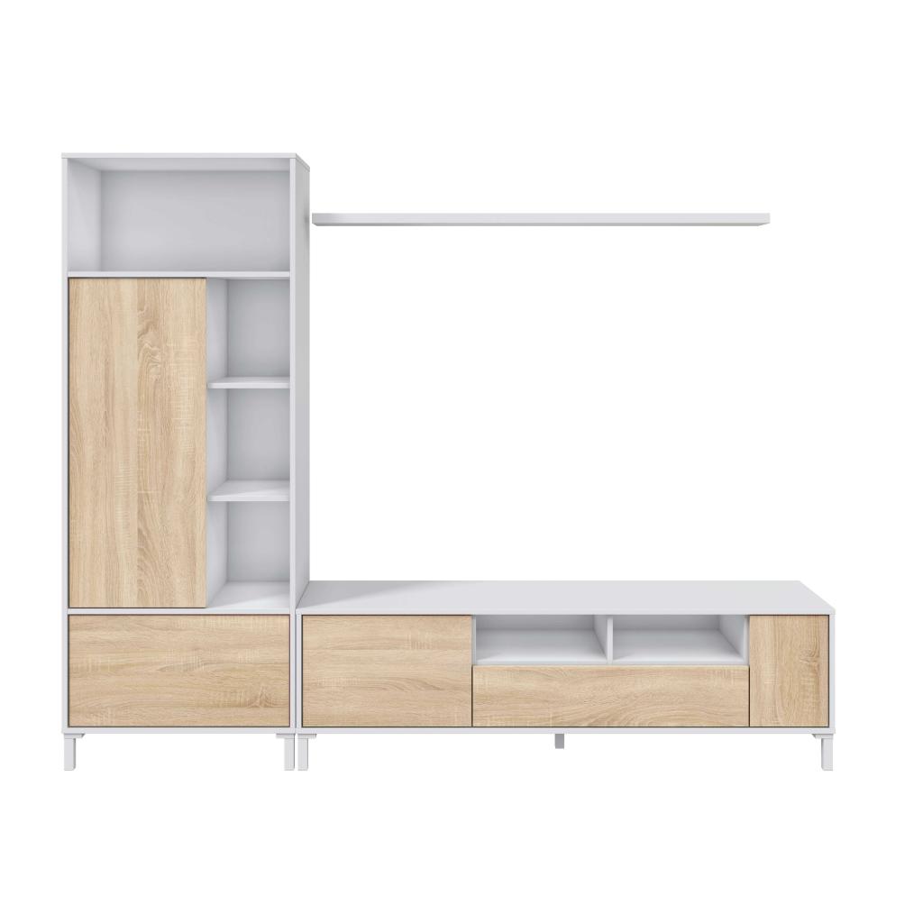 Rebajas Oferta Novedad Composición de Salón Ref: 015400000560 199,99 € Composición de salón modero y versátil, en color blando y roble. Compuesto por vitrina y mesa TV. Composición: Tablero de partículas, tablero de fibras, lámina de papel, borde de plástico. Disponibilidad: Color Blanco / Roble Tamaño Vitrina 65x172x40 cm Mesa TV 150x45x40 cm Estante 210x35x25 cm Ancho x Alto x Fondo Cantidad