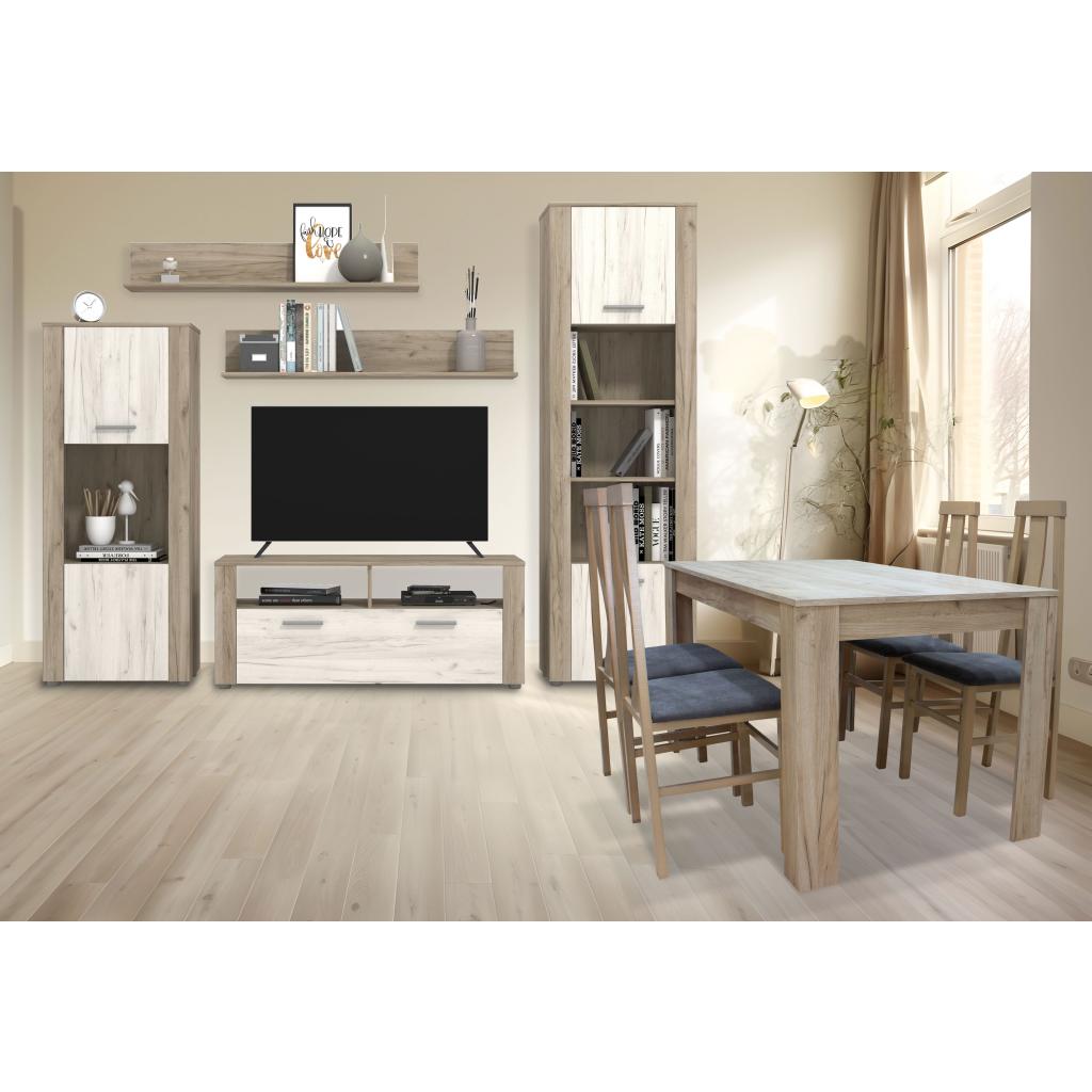Conjunto de salón - Nordik claro / oscuro, Apilable Vitrina 56x184,5x33 Bodeguero 56x139x33 Mesa Tv 117x49x40 Estante 116x20x20 cm Mesa 80x75x135 cm Sillas 44x110x41 cm Ancho x Alto x Fondo