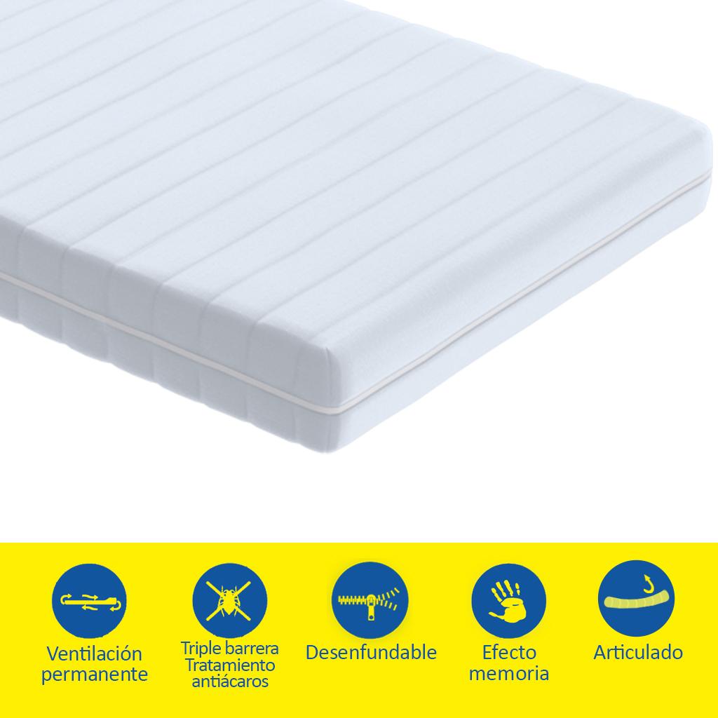 Colchón articulado con 5 zonas de confort y descanso diferenciadas. Núcleo Eliocel de poliuretano de gran elasticidad y viscoelástica de gran adaptabilidad transpirable de poro abierto con canales horizontales que favorecen la ventilación impidiendo así la aparición de ácaros y humedades. Articulación suave sin ejercer puntos de presión por la estructura de su núcleo. Funda acolchada en fibra con cremallera. Tejido certificado según el Standard 100 de Oeko-Tex. Se presenta en formato enrollado con bolsa de plástico y caja de cartón para su fácil transporte