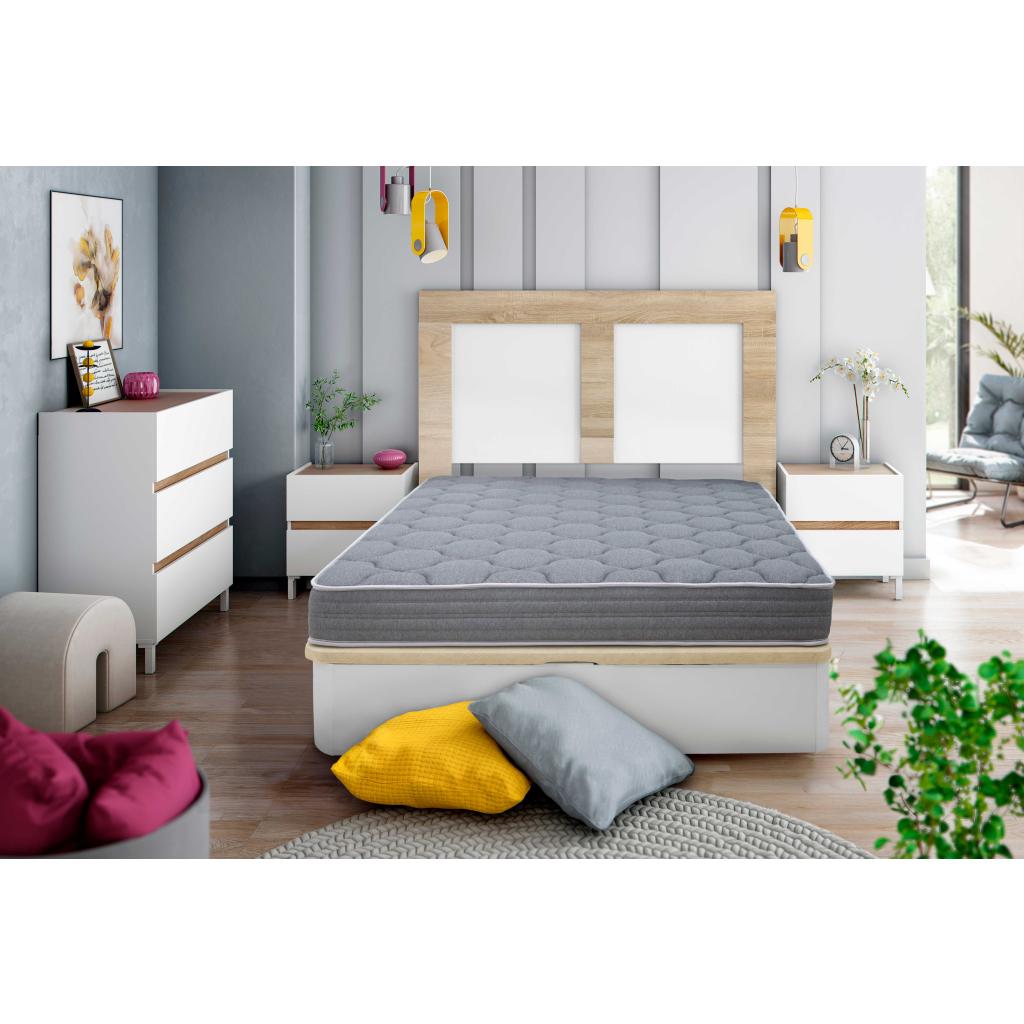 Dormitorio completo: Cabeero, 2 mesitas, cómoda, colchón y canapé. En color blanco y roble, canapé en blanco y roble abatible de gran capacidad (135 ó 150x190) Y colchón (135 ó 150x190). Composición: Tablero de partículas, tablero de fibras, lámina de papel, borde de plástico.