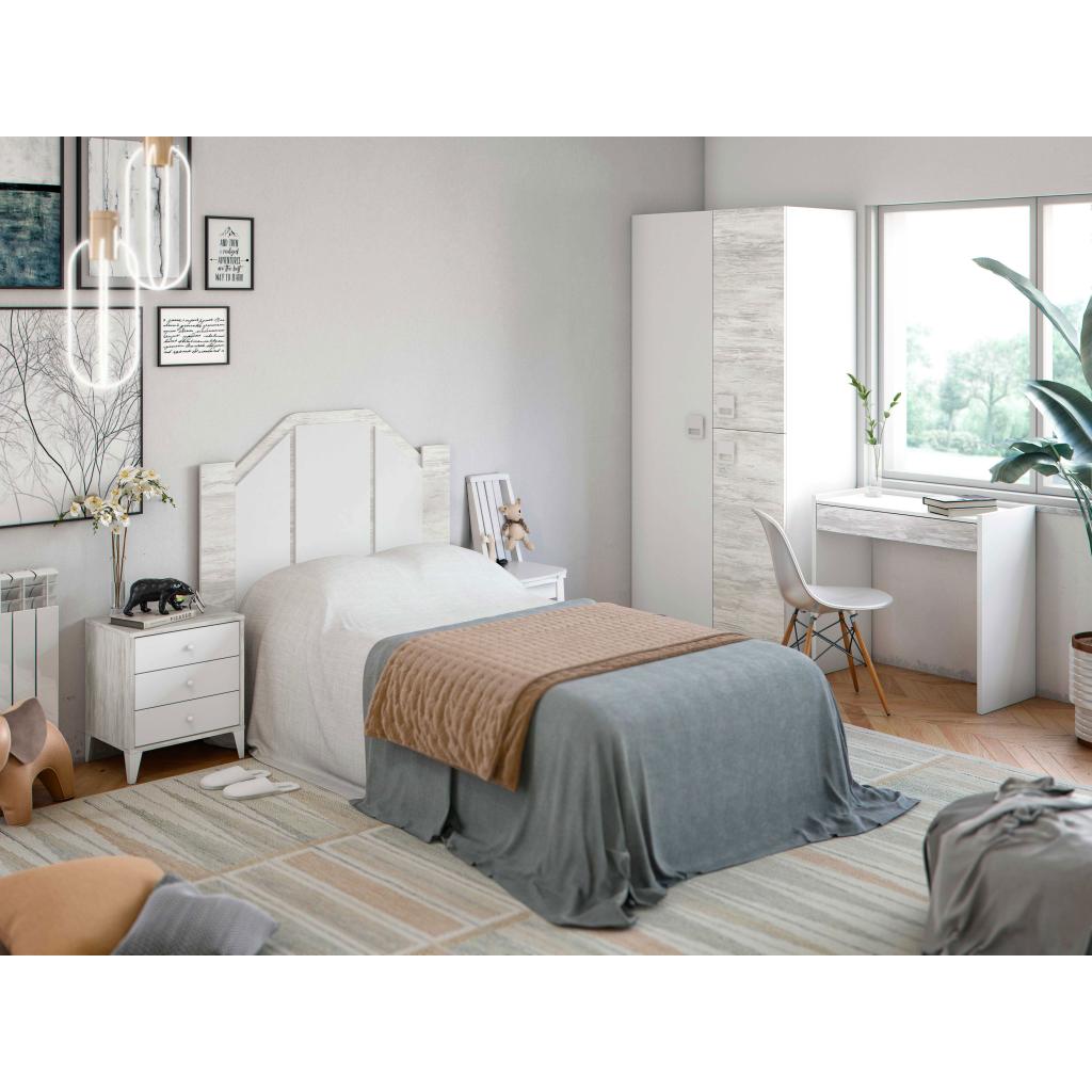 Rebajas Oferta Novedad Dormitorio Juvenil (Cabecero 105cm) Ref: 999700001897 369,99 € Dormitorio juvenil en color blanco y ártico, compuesto por cabecero 105 cm, mesita, escritorio y armario de 3 puertas.Composición: Tablero de partículas, tablero de fibras, lámina de papel, borde de plástico. Disponibilidad: Color Blanco Artik / Blanco Velho Tamaño Cabecero 116x117x3 cm Mesita 44x50x33 cm Armario 90x200x52 cm Escritorio 81,5x77x40 cm Ancho x Alto x Fondo Cantidad