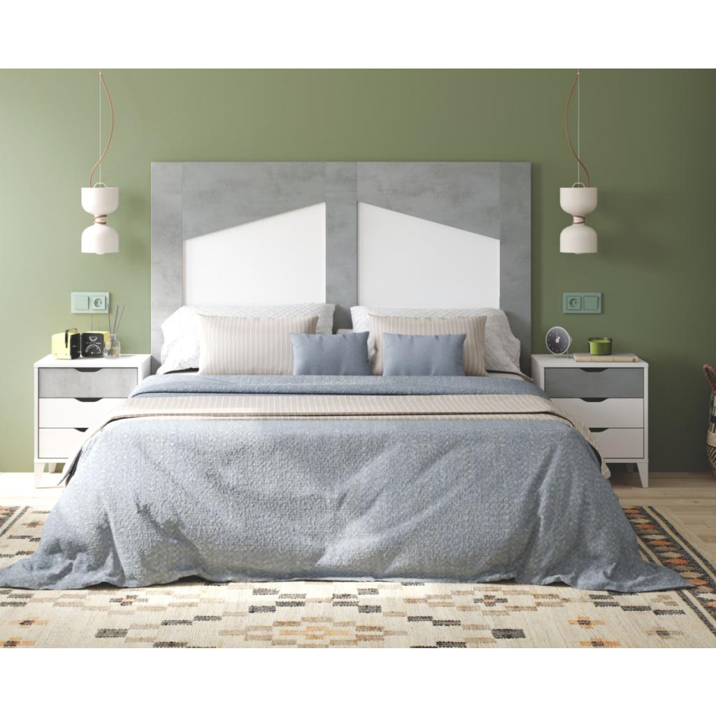 Rebajas Oferta Novedad Dormitorio de matrimonio Ref: 015400000553 194,99 € Dormitorio de matrimonio moderno y versátil, compuesto por cabecero (2 posiciones) y 2 mesistas en color blanco y cemento.Composición: Tablero de partículas, tablero de fibras, lámina de papel, borde de plástico. Disponibilidad: Color Blanco / Cemento Tamaño Cabecero 160x132x3 cm Mesitas 44x50x33 cm Ancho x Alto x Fondo Cantidad