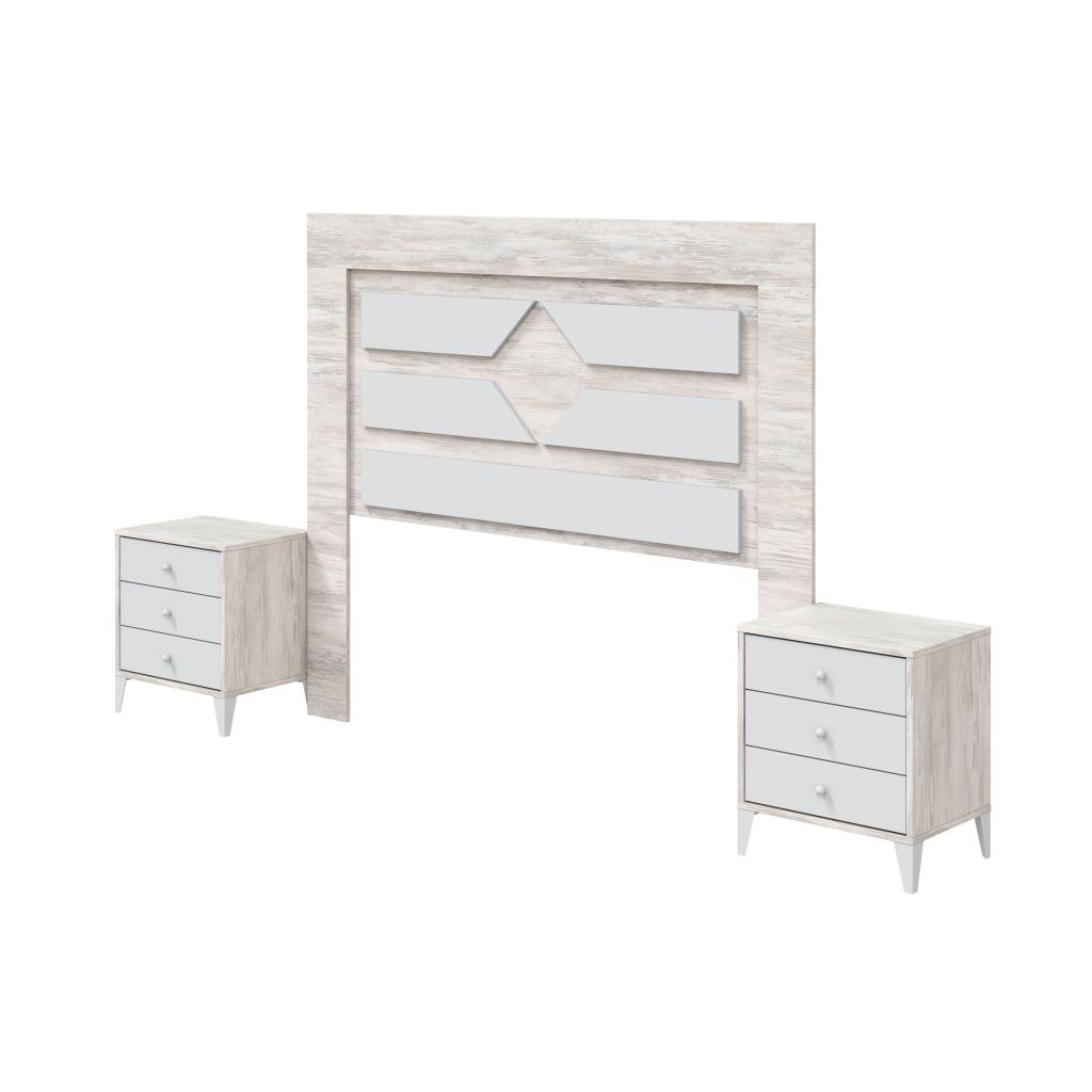 Rebajas Oferta Novedad Dormitorio de Matrimonio Ref: 015400000575 189,99 € Cabecero para cama de 160/150/140 cm con dos mesitas y 2 cajones .Composición: Poliuretano, Polipropileno, tejido 100% poliéster. Disponibilidad: Color Blanco Velho/Blanco Artik Tamaño Cabecero 160x136x3 cm Mesitas 44x50x33 cm Ancho x Alto x Fondo Cantidad