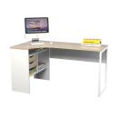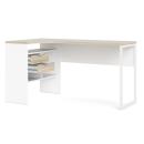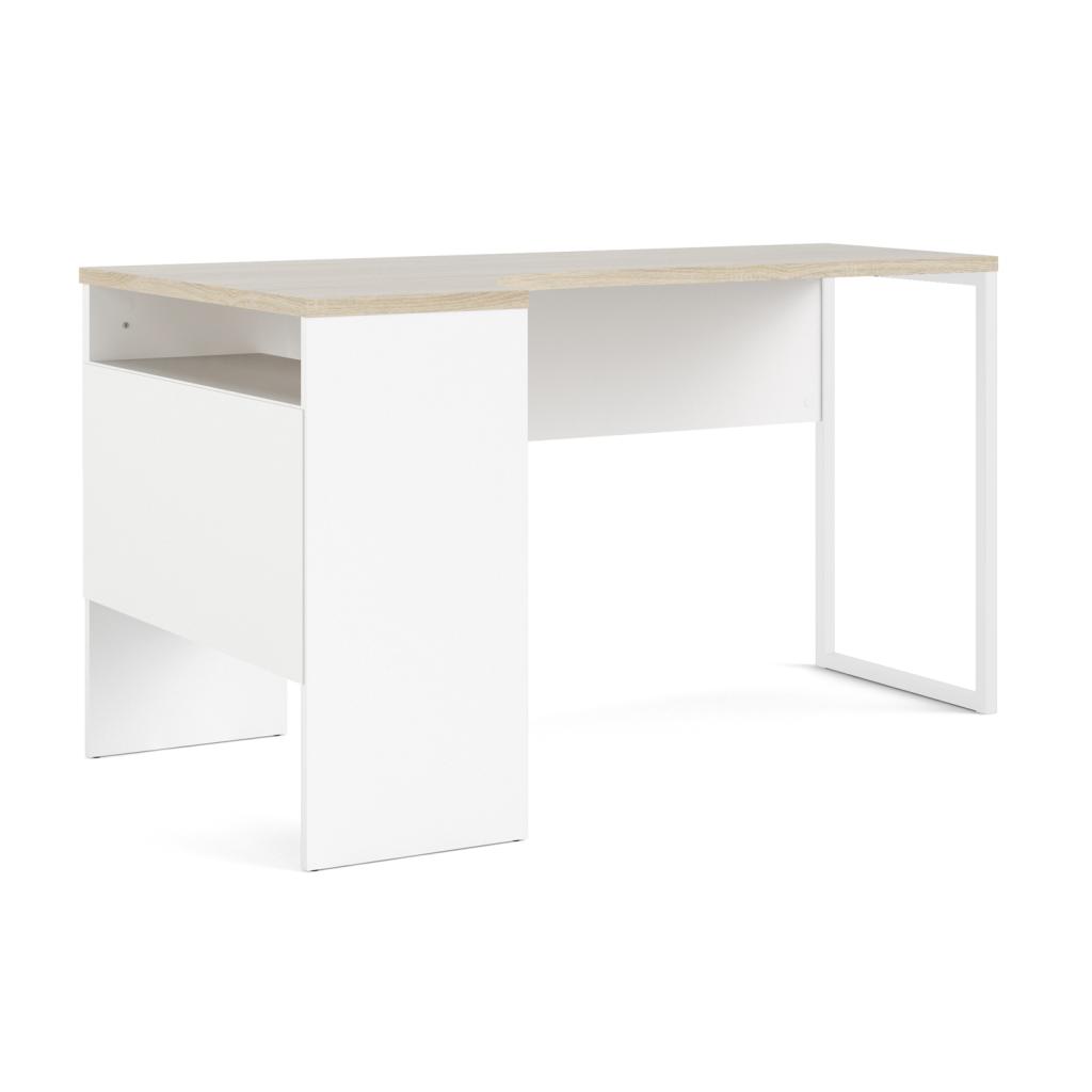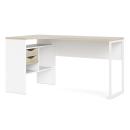 Mesa de escritorio de estilo nórdico, en color blanco y roble. Con pata metálica, 2 cajones y 2 estantes. Su ángulo es ideal para adaptarse a cualquier espacio del hogar.